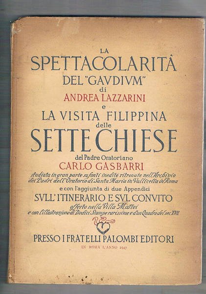 La spettacolarità del "Gavdivm" di A. Lazzarini e la visita filippina delle Sette Chiese del padre dell'oratorio C. Gasbarri, studiata in gran parte su fonti inedite ritrovate nell'archivio dei Padri dell'Oratorio di santa Marta in Vallicella in Roma, con l'aggiunta di due appendici sull'itinerario e sul convito offerto nelle Villa Mattei con 12 stampe.