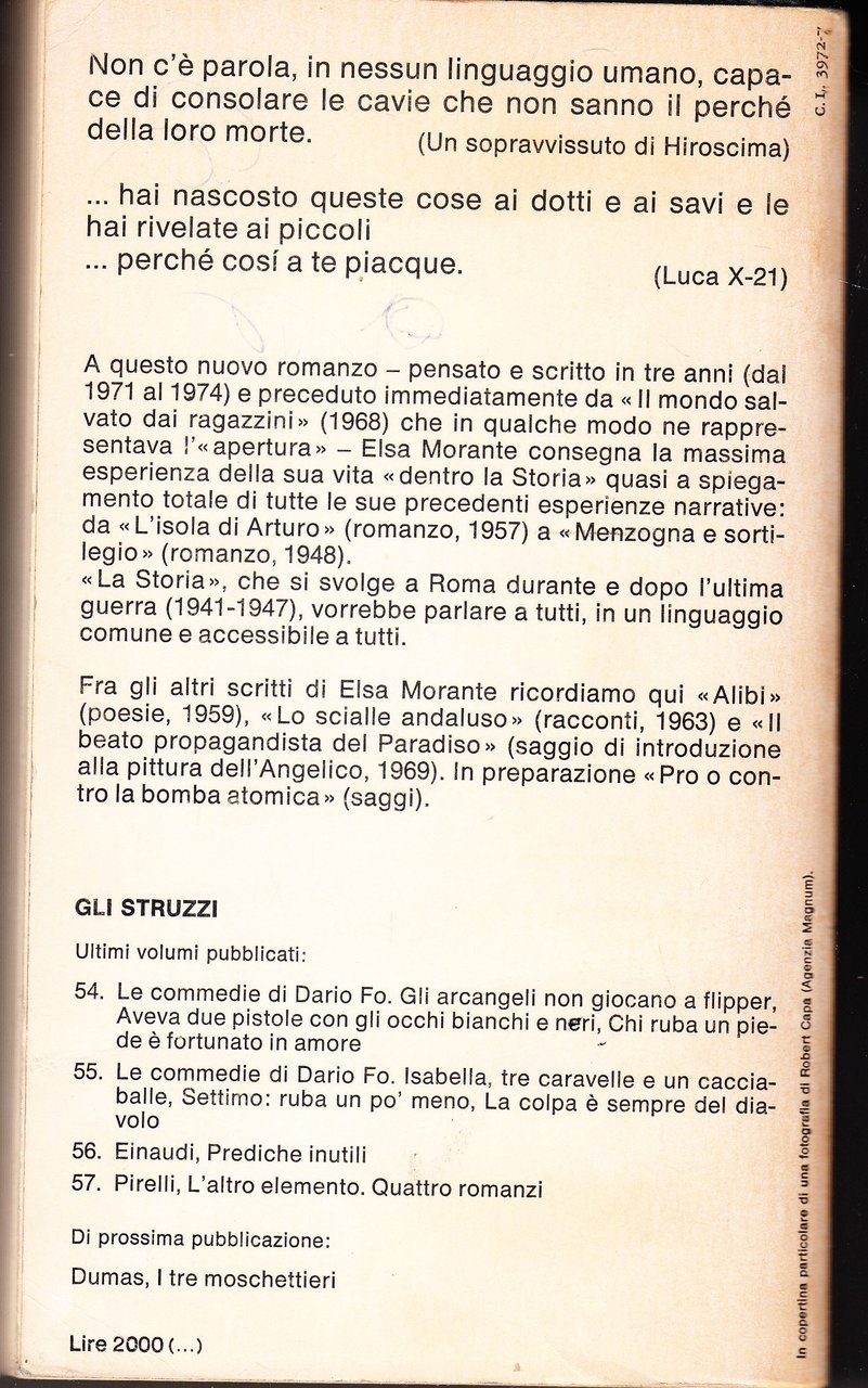 Prima edizione del 13 aprile 1974, pubblicata per volontà dell'Autrice direttamente in brossura e in edizione economica al prezzo simbolico di 2000 lire e in una tiratura di centomila copie. L'esemplare presenta lievi bruniture al piatto e al dorso, e due leggerissimi ghirigori al retro, ma nel complesso si presenta in uno stato molto buono.
