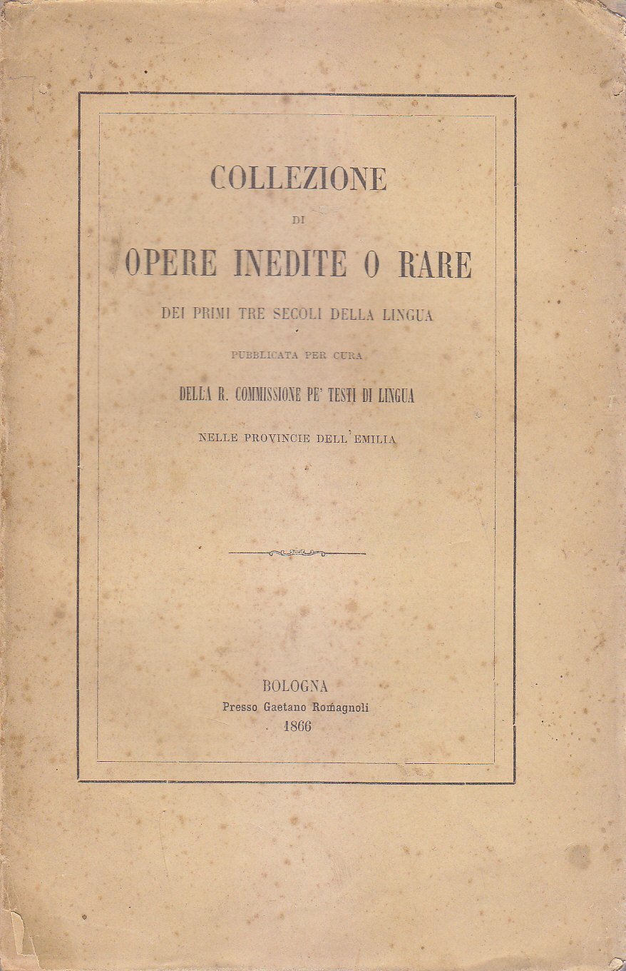 per cura e con illustrazioni di Filippo Luigi Polidori. collezione di opere inedite e rare.Bologna presso Gaetano Romagnoli 1865.336 Pagine, testo su due colonne. Copertina editoriale in brossura. Stato di conservazione: molto buono (pagine normalmente ingiallite, fioriture,
