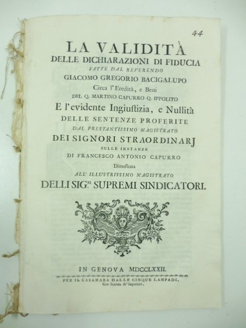 La validita' delle dichiarazioni di fiducia fatte dal reverendo Giacomo Gregorio Bacigalupo circa l'eredita' e beni del Q. Martino Capurro Q. Ippolito e l'evidente ingiustizia e nullita' delle sentenze proferite dal prestantissimo magistrato. sulle istanze di Francesco Antonio Capurro.