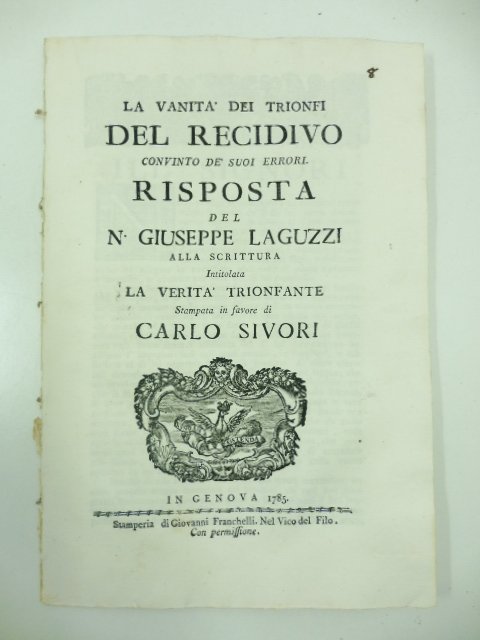 La vanita' dei trionfi del recidivo convinto dei suoi errori. Risposta del N. Giuseppe Laguzzi alla scrittura intitolata La verita' trionfante stampata in favore di Carlo Sivori