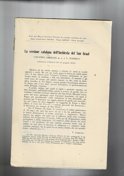 La versione catalana dell'inchiesta del San Graal. Estratto dagli Atti del Reale Istituto Veneto di scienze lettere e arti del 1913-1914.