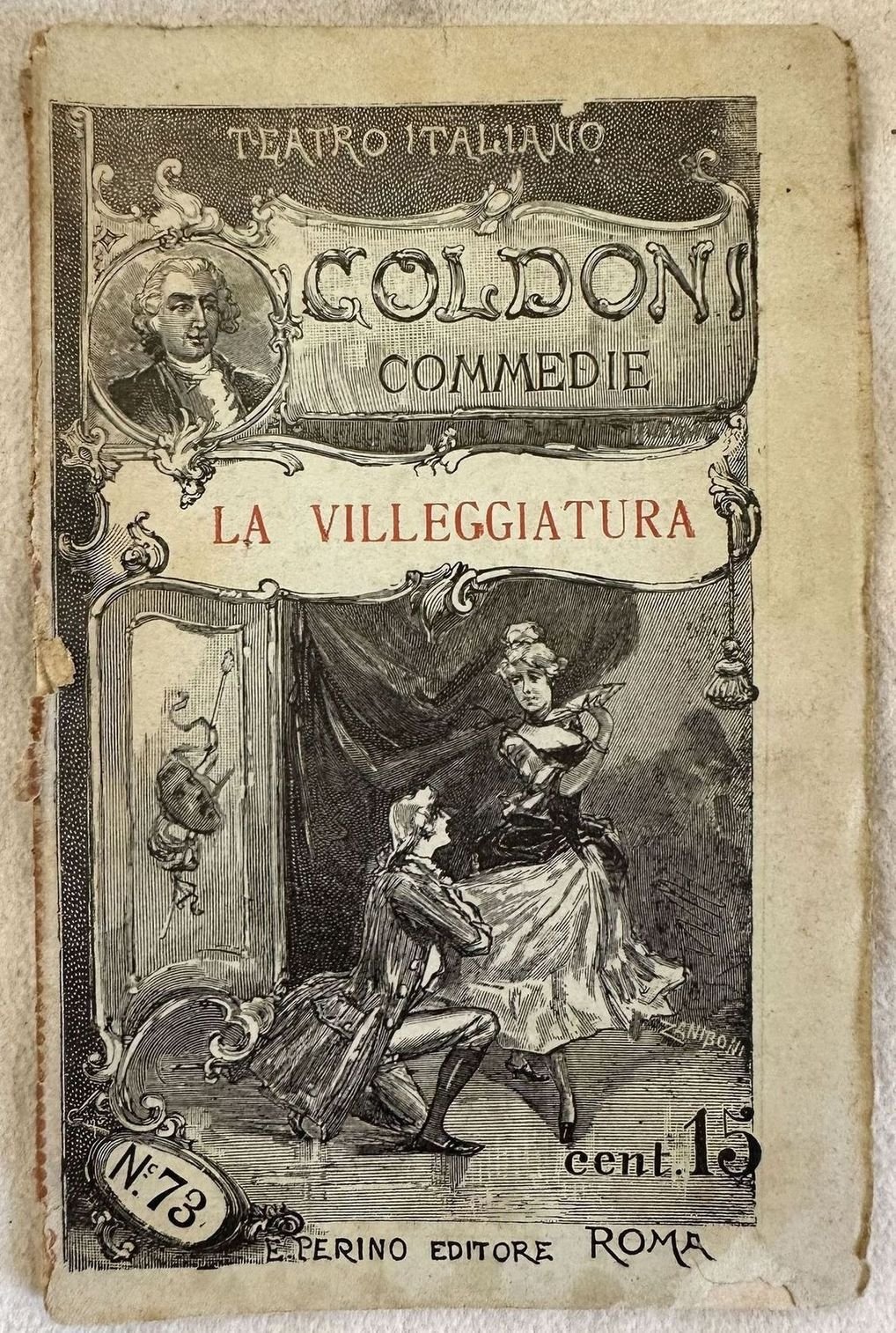 Edizione Perino del 1892 della commedia "La villeggiatura" di Carlo Goldoni della collana "Teatro italiano". Sono presenti due incisioni a piena pagina, una delle quali in antiporta. In mediocri condizioni. Copertina editoriale in discrete condizioni con lievi usure marginali. Piatto anteriore in parte staccato. Legatura in buone condizioni. Pagine in buone condizioni generali con fioriture. In 16. Dim. 17,5x11 cm. Pp. 64.Perino edition of 1892 off the play "La villeggiatura" by Carlo Goldoni of the series "Teatro italiano". Inside there are two engravings, one of them in the frontspice. In poor conditions. Editorial cover in fair conditions lightly worn in the extremities. Front plate partially detached. Binding in good conditions. Pages are in good conditions with foxing. In 16. Dim. 17,5x11 cm. Pp. 64.