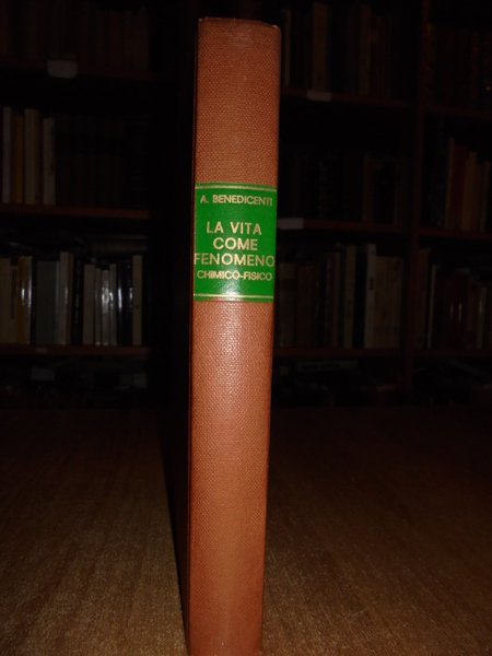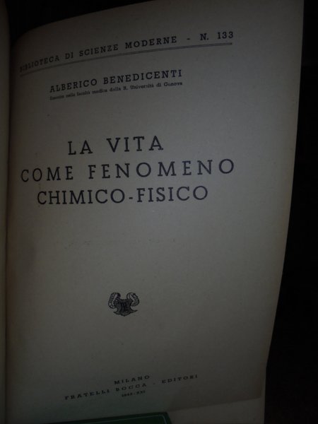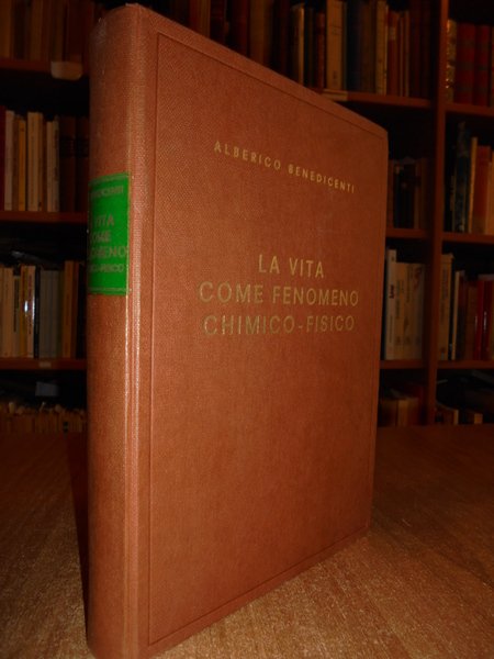 Alberico, Benedicenti. Milano, Fratelli Bocca Editori, 1943. La vita come fenomeno chimico-fisico. In-8°, tela edit. con titoli in oro sul piano e al dorso. 451 pp. con illustrazioni e schemi in bianco e nero n.t. Carta con naturale uniforme ingiallimento dovuto alla scarsa qualità, peraltro libro in ottimo stato di conservazione. Neg. mob. 21 sotto Bol.