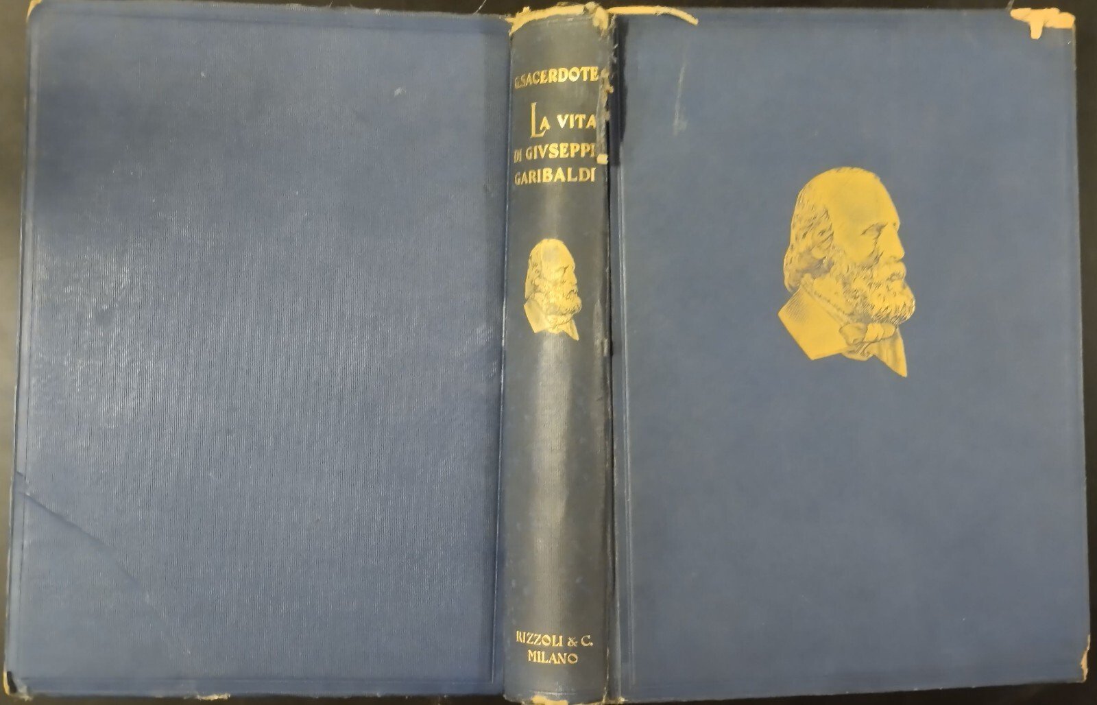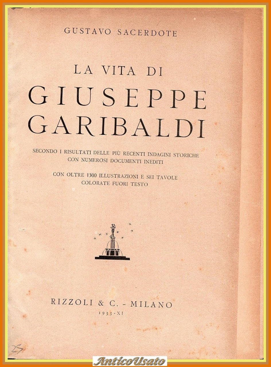 LA VITA DI GIUSEPPE GARIBALDI secondo i risultati delle più recenti indagini storiche con numerosi documenti inediti di Gustavo Sacerdote. Rizzoli Editore, 1933 . 960 pagine, oltre 1300 illustrazioni in bianco e nero nel testo e diverse tavole a colori fuori testo. Copertina editoriale in tutta tela con ritratto dell'eroe in oro al piatto anteriore e al dorso. Stato di conservazione: buono (pagine normalmente ingiallite, copertina un po' sciupata con mancanze soprattutto agli angoli e al dorso) Libro usato saggistica biografia risorgimento eroe dei due mondi