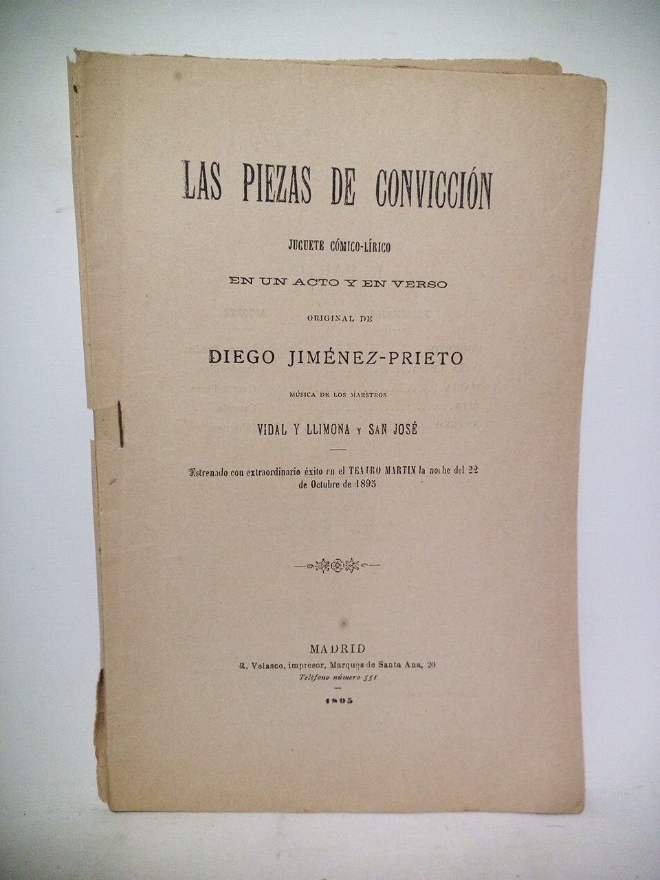 Las piezas de convicción. (Juguete cómico-lírico en un acto y en verso. Estrenado con extraordinario éxito en el Teatro Martín, la noche del 22 de Octubre de 1895) | Livres anciens et modernes | Jimenez-Prieto, Diego
