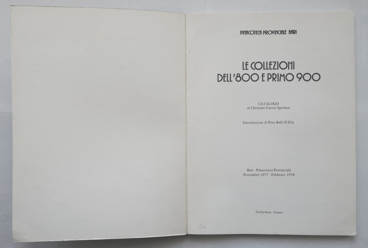 LE COLLEZIONI DELL'800 E PRIMO 900. Mostra, Pinacoteca Provinciale Bari, novembre 1977 - febbraio 1978. Catalogo di Christine Farese Sperken.