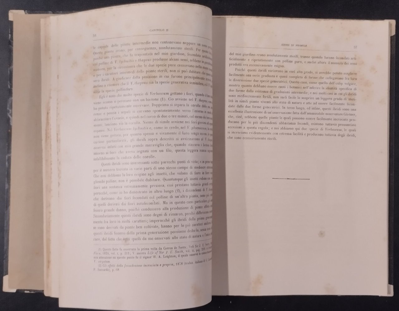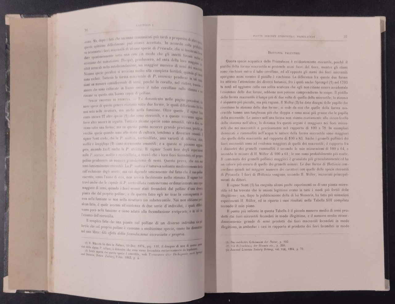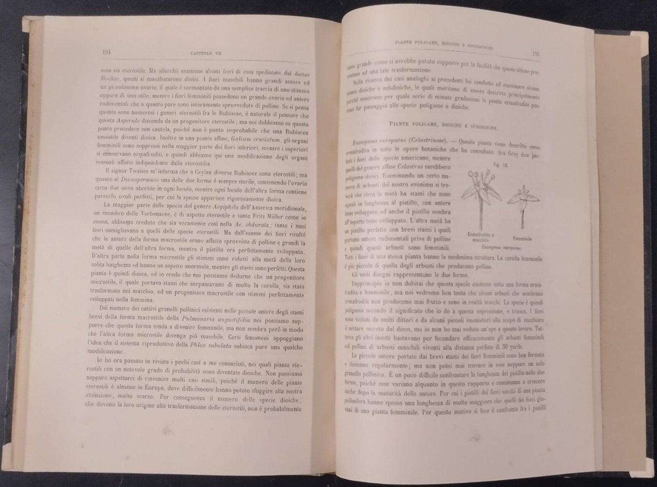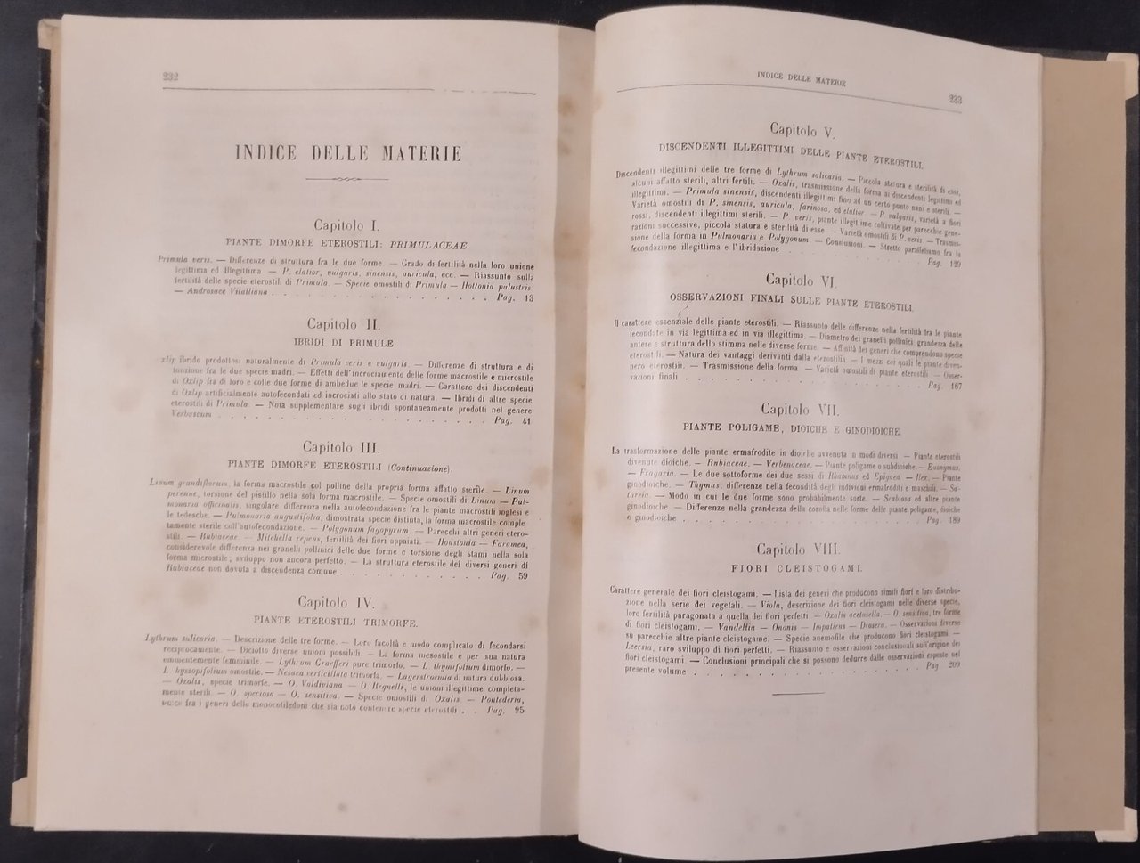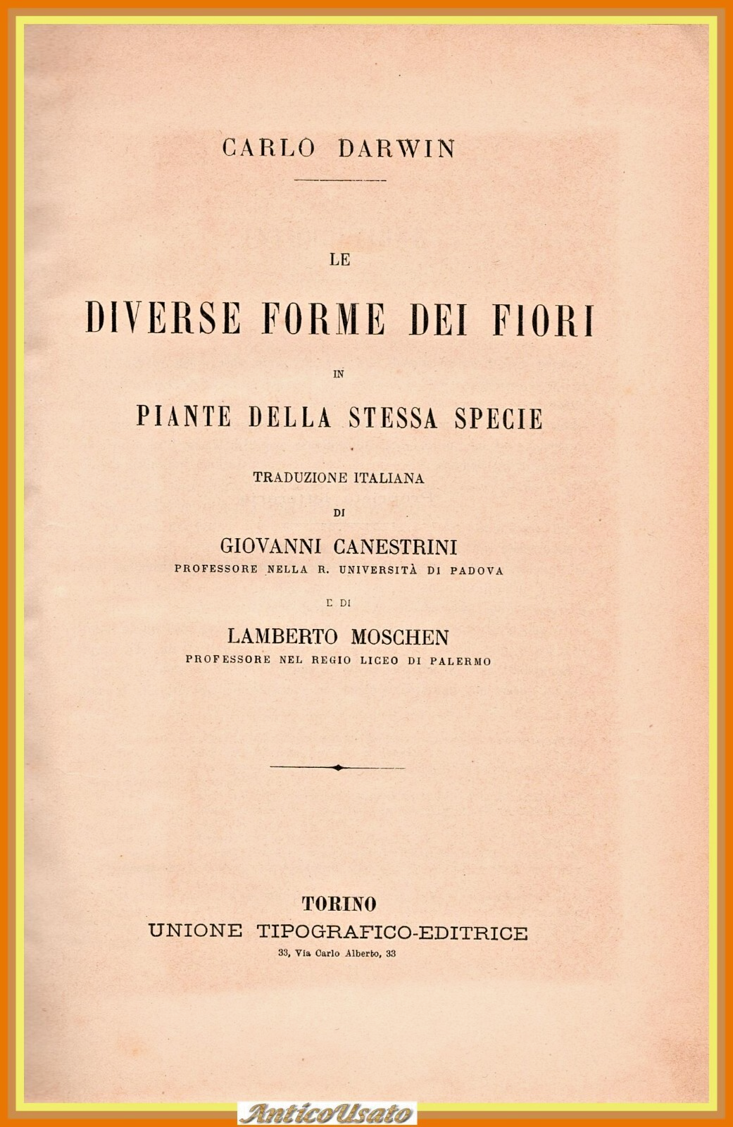 LE DIVERSE FORME DEI FIORI IN PIANTE DELLA STESSA SPECIE di Carlo Darwin. Torino , Unione tipografico Editrice, 1884?. Traduzione italiana di Giovanni Canestrini e Lamberto Moschen.239 pagine, 15 illustrazioni in bianco e nero nel testo. Copertina coeva in mezza pergamena. Stato di conservazione: molto buono (pagine normalmente ingiallite) Libro usato saggistica