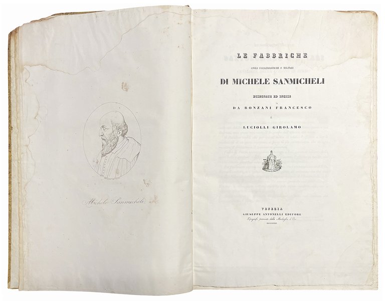 Seconda edizione della celebre opera monografica sul famoso architetto rinascimentale pubblicata a Verona tra il 1823 ed il 1830 a fascicoli e successivamente da Antonelli a Venezia nel 1831. Nell'opera sono descritte tutte le opere architettoniche del Sanmicheli, illustrate dalle tavole di Ronzani e Luciolli.