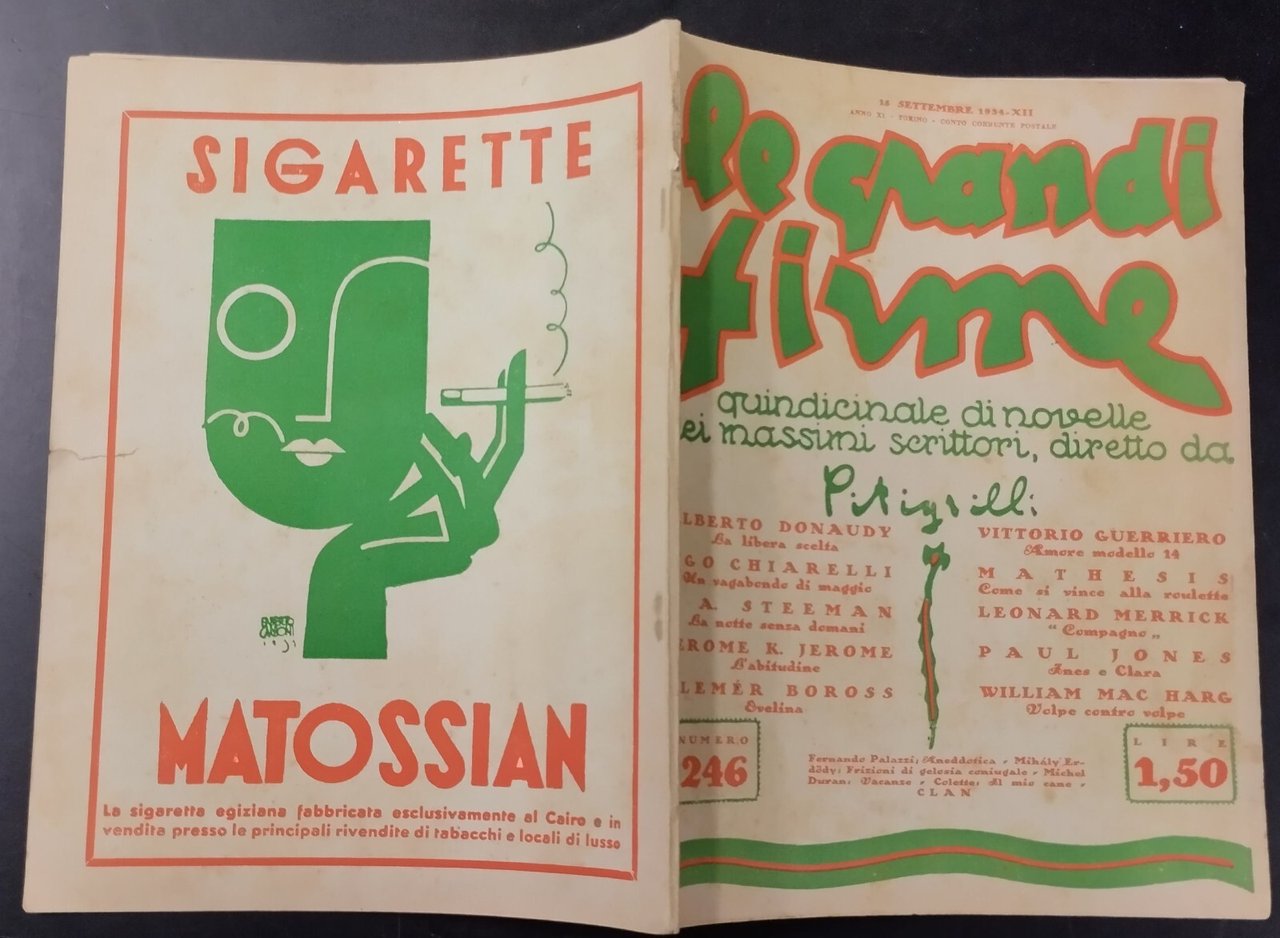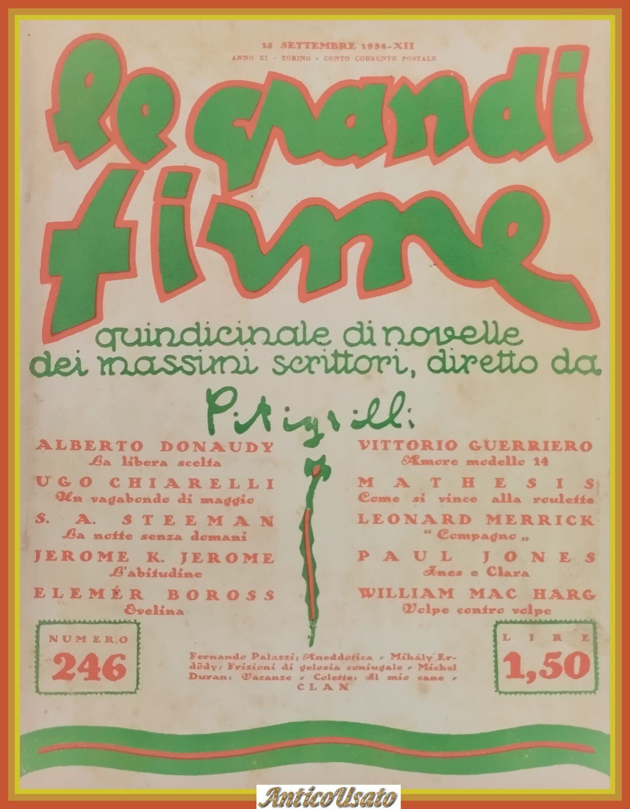 Anno XI; numero 246 15 settembre 1934. 48 pagine, numerose illustrazioni in bianco e nero nel testo. Copertina editoriale in brossura . Stato di conservazione: buono (pagine ingiallite, piccola mancanza all'ultima pagina con minima perdita di testo, strappo al piatto posteriore) Libro usato narrativa racconti