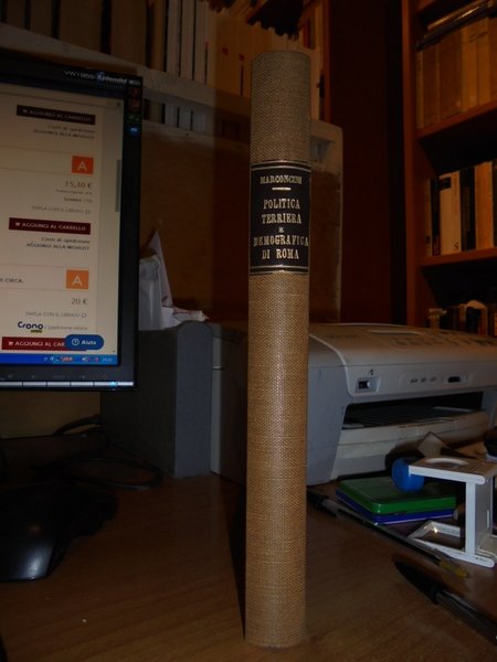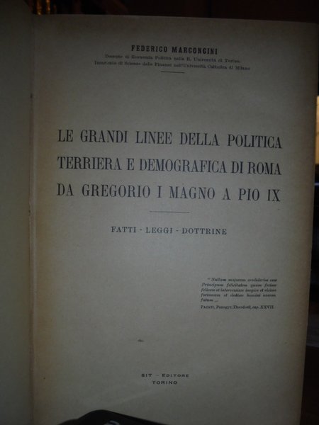 Federico, Marconcini. Torino, SIT - Editore, s.d. (1920 - 1930). Le grandi linee della politica terriera e demografica di Roma da Gregorio I Magno a Pio IX. In-8°, tela con titolo in oro entro tassello al dorso, copertine originali conservate. 270 pp. Esemplare ottimamente conservato in legatura recente con le brossure originali conservate. Uff. B - III - 4