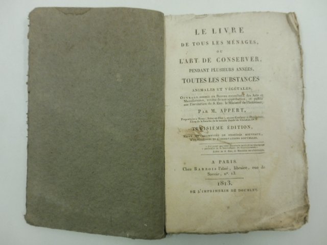 In 8, pp. XXXXVIII +176 con 1 tav. f. t. rip. Br. Firma aut. dell'a. Terza edizione (la prima risale al 1810) di questo importante testo che vinse il premio indetto da Napoleone per chi avesse inventato un procedimento atto alla conservazione dei cibi. Il confetturiere F. N. Appert scopri il sistema di far bollire gli alimenti per poi conservarli in scatole di latta chiuse ermeticamente.