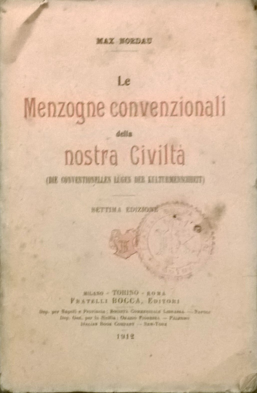 LE MENZOGNE CONVENZIONALI DELLA NOSTRA CIVILTA' di Max Nordau Bocca Editori 1912 X + 370 Pagine Copertina editoriale in brossuraStato di conservazione: buono (pagine normalmente ingiallite,