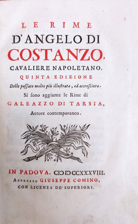 Quinta ed.Si sono aggiunte le Rime di Galeazzo di Tarsia. marca tipografica, capilettera illustrati, testine e finalini. in ottavo leg. tutta pergamena, titolo in oro al tassello, nervi. pp. 186, (6) Buono (Good) Ottimo e fresco es..