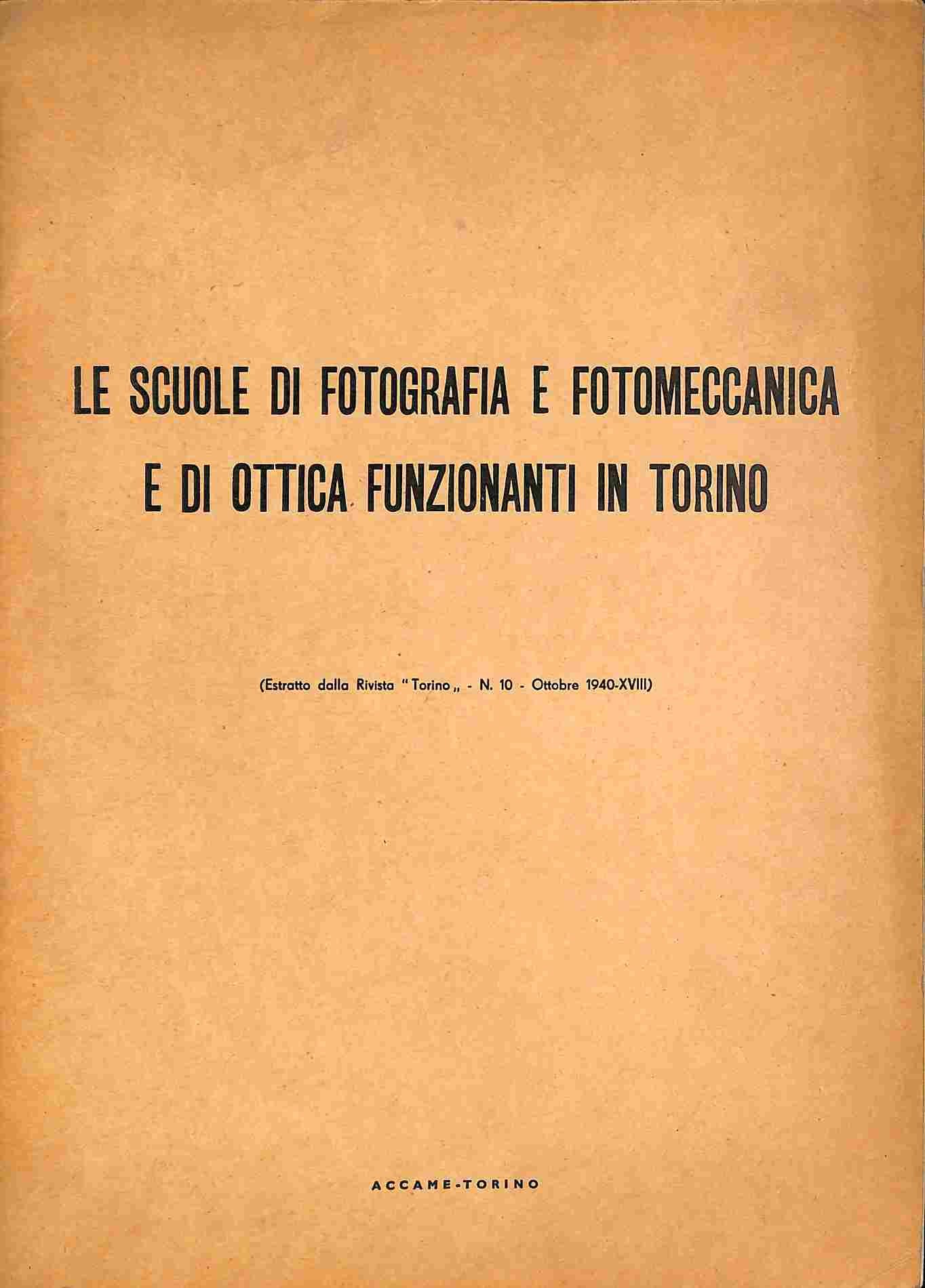 In 4 (cm 22,5 x 31 circa), pp. 12 con riproduzioni fotografiche in bianco/nero. Brossura editoriale. Estratto editoriale dalla rivista "Torino", n. 10, ottobre 1940. Interessante articolo, corredato da belle immagini, relativo alle scuole di fotografia e di ottica della citta' di Torino con immagini della scuola Rossi di Montelera e della scuola Pacchiotti.