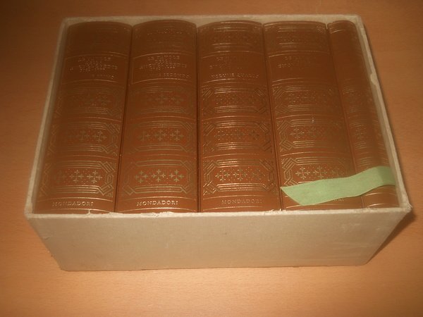 Arnoldo Mondadori Editore, 1977, 4 voll. + indice, ristampa anastatica dell'opera completa, cofanetto in cartone, copertina mezza pelle con scritte in oro sul dorso, pag. 3115, pag. indice 302, formato singolo volume cm. 10 x 17 - ottimo stato, vol. 3° con angolo in basso a dx lievemente liso, cofanetto in cartone con piccoli segni