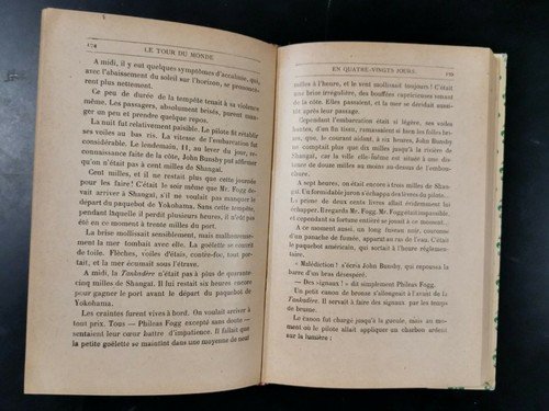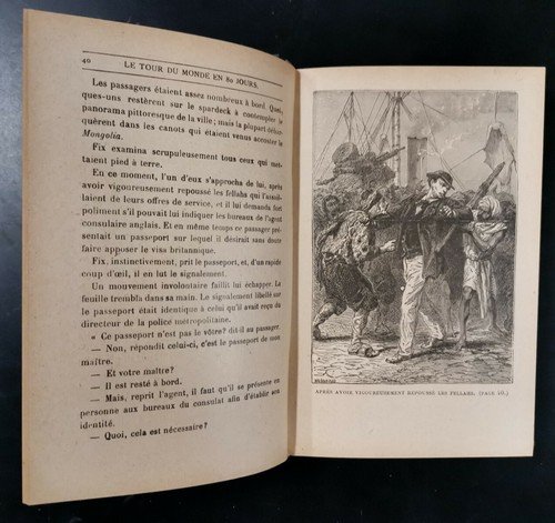 LE TOUR DU MONDE EN QUATRE VINGTS JOURS di Jules Verne. Hachette Editore 1921. In lingua francese. 514 pagine, belle illustrazioni b/n nel testo e fuori testo di Neuville e Benette. Bella copertina non originale in mezza tela. Dimensioni 11,5x18 cm. Stato di conservazione: molto buono.(pagine normalmente ingiallite)