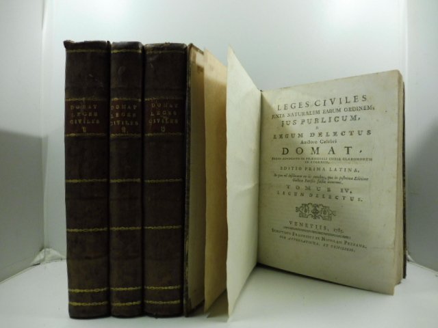 4 voll. in 4, pp. LXIV + 512 + (2); VIII + 376 + (2); XXVIII + 444 + L; XVI + 540. M. pl. coeva con tassello al d. Prima edizione latina di questo testo di capitale importanza. Jean Domat fu uno dei principali sistematori del sistema giuridico francese durante il sec. XVII. In quest'opera Domat riusci' ad esporre il materiale tradizionale (il materiale disordinato dello Jus commune) dandogli nuovo ordine evidenziandone la logica coerenza come sistema. Graesse, 2, 419.