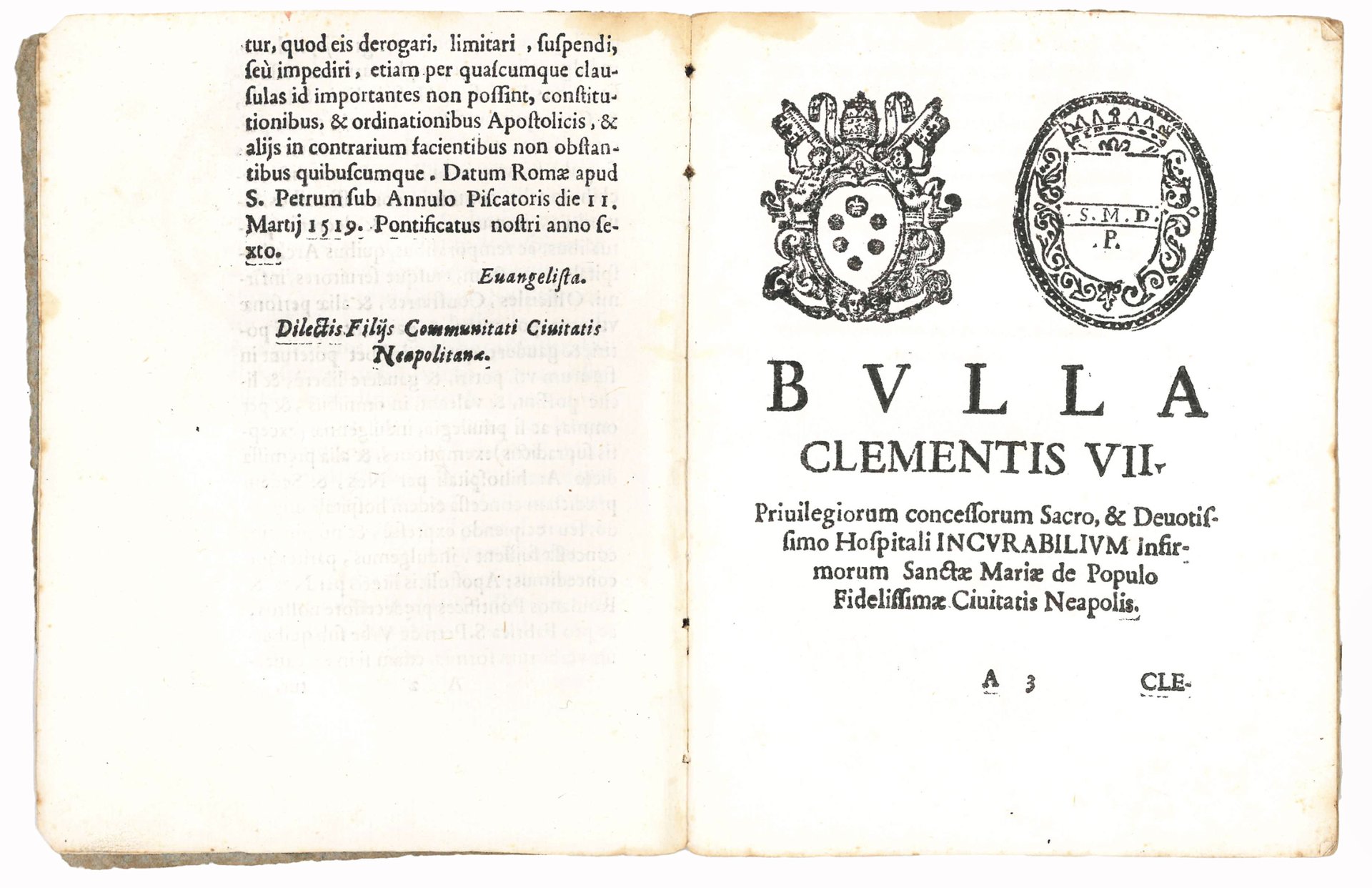 LEO X (Pope, 1513-1521). Bulla fundationis Hospitalis Incurabilium civitatis Neap. Leo Papa X. Incipit: "Nuper pro parte Vestra". Issued on March 11, 1519. [followed by:] CLEMENS VIII (Pope, 1523-1534). Bulla Clementis VII Privilegiorum concessorum Sacro, & Devotissimo Hospitali Incurabilium infirmorum Sanctae Mariae de Populo Fidelissimae Civitatis Neapolis. Incipit: "Ex supernae dispositionis arbitrio". Issued on December 11, 1523. N.pl., n.pr., n.d. [presumably Rome, 1523]