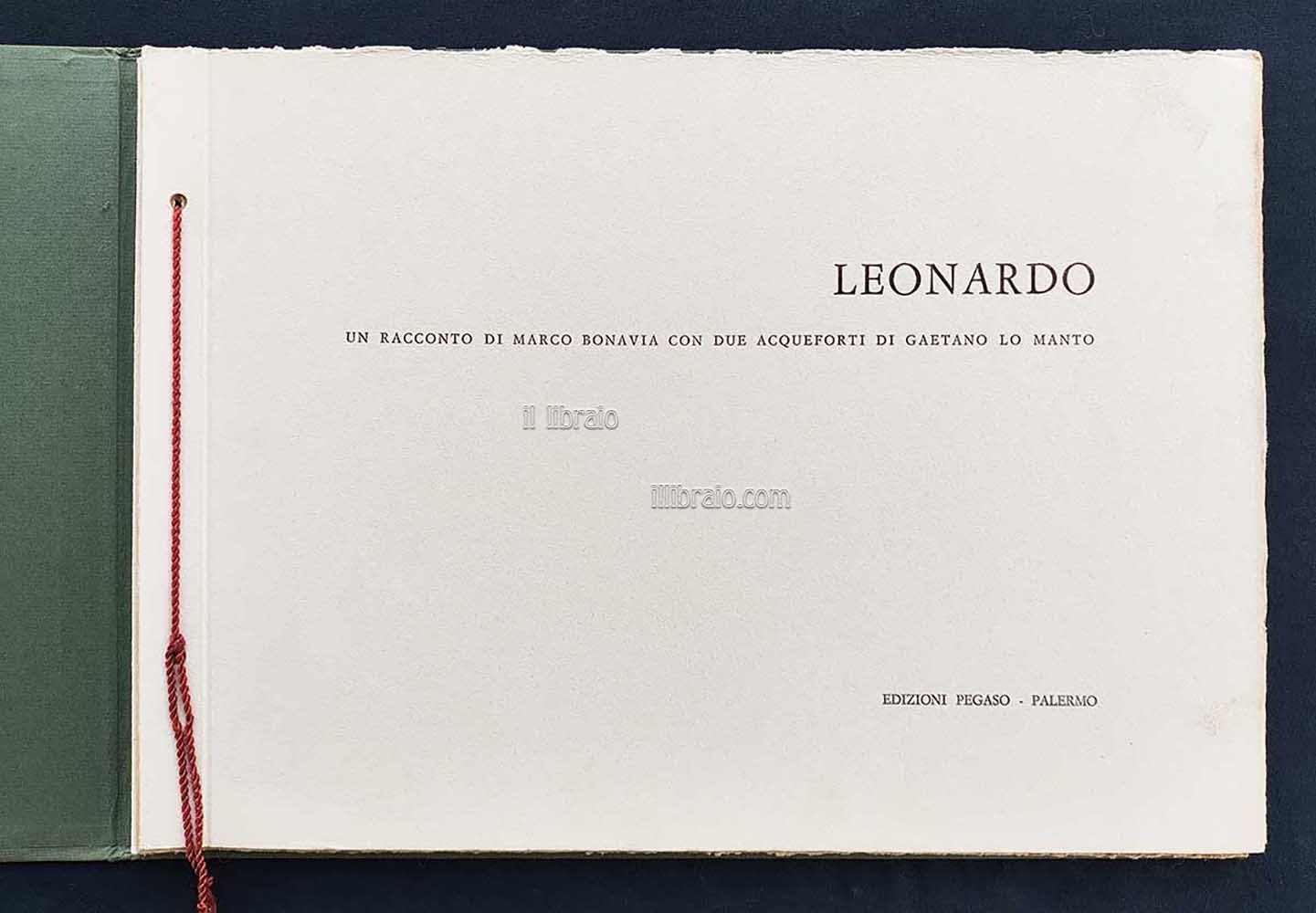 oblungo (26 x 35 cm. ca.); pp. 8 + 2 tavv. (ill. in bn.); leg. Pubblicazione stampata nel ricordo di Calogero Bonavia e Gino Morici. Questo album è composto da un inedito di Marco Bonavia e due acqueforti di Gaetano Lo Manto. Tiratura in 150 esemplari firmati e numerati a matita dall’autore da 1 a 125 in cifre arabe e da I a XXV in cifre romane (ns. 82). Legatura in cartoncino rigido con cordoncino passante