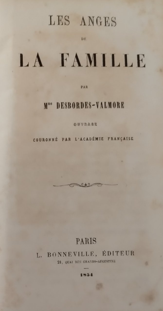 LES ANGES DE LA FAMILLE di Madame Desbordes Valmore. Paris, Bonneville Editore, 1834 . 245 pagine, incisione in bianco e nero fuori testo in antiporta. Copertina coeva in tutta tela. Dimensioni: 18 x 11,5 cm. Stato di conservazione: molto buono (fioriture, copertina un po' allentata, piccole mancanze al dorso) Libro ANTICO narrativa letteratura francese