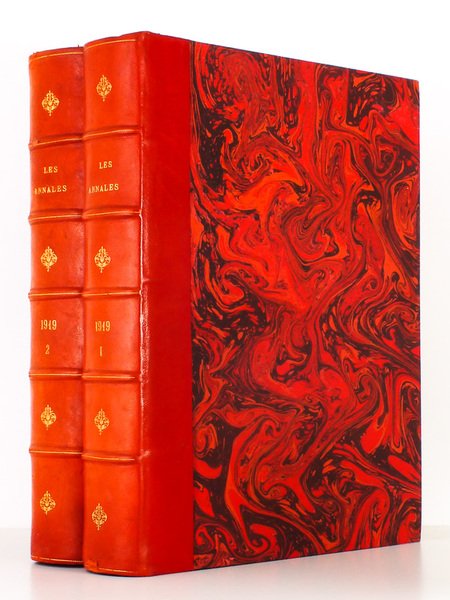 2 vol. grands in-4 reliés demi-basane rouge, dos orné à 5 nerfs, couv. conservées, texte sur trois colonnes, ill. noir et blanc, Les Annales politiques et littéraires, 1919, 632-VIII pp. + 635-VIII pp. Bon état. D'autres années de publication sont disponibles. Prix pour l'ensemble. Les Annales Politiques et Littéraires étaient une revue hebdomadaire fondée en 1883 par Jules Brisson et reprise par son fils Adolphe (1860-1925). Cette revue à caractère politique, littéraire et artistique connut un succès certain, avec un tirage qui culmina à environ 200.000 exemplaires pendant la première Guerre Mondiale.