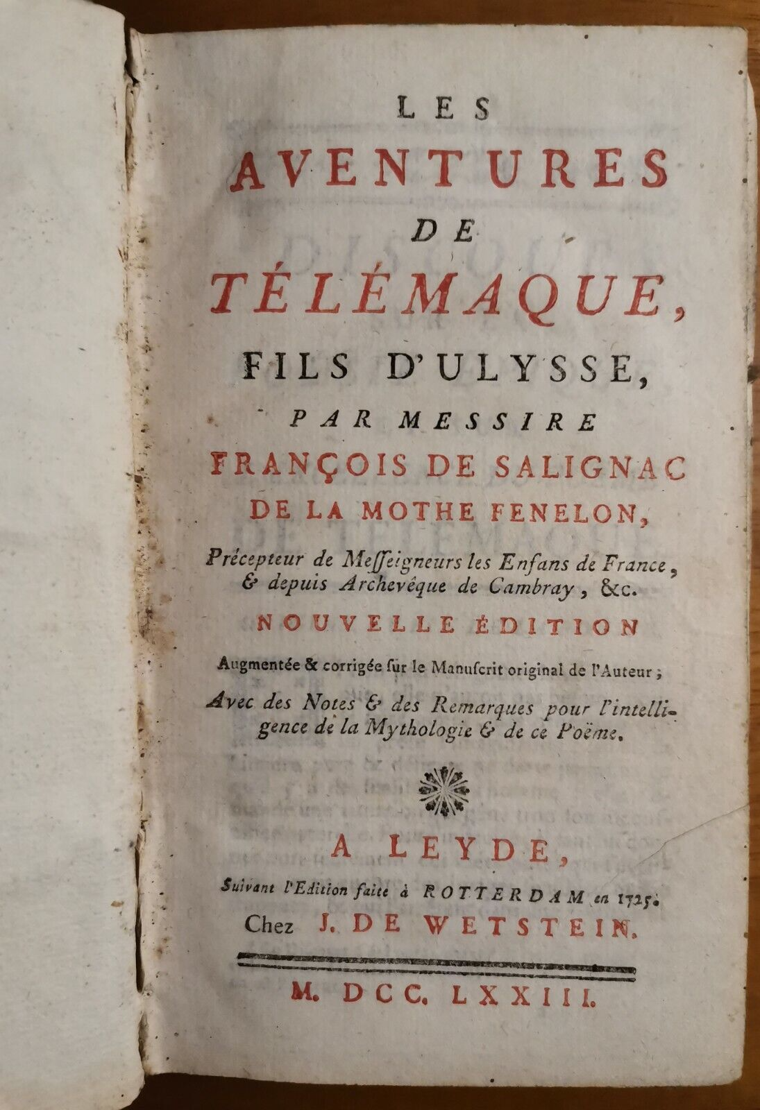 LES AVENTURES DE TELEMAQUE FILS D'ULYSSE Fenelon Francois De Salignac 1773 Libro