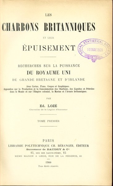 559pp, 560-1229pp + maps + errata VG/none First edition, in French. Editorial red cloth with gilt author and title on front board and spine, slightly worn with small stains, minute dent on the spine of vol.I, Royal Statistical Society sticker on the rear boards, one leaf in vol.I torn (no loss, repairable), unobstrusive stamps of the RSS throughout incl. Title page, Author's signed presentation on preliminary leaf detached in vol.I, small loss on margins in frontespice of vol.II, paper slightly browned on margins. Despite the defects observed it remains a nice set, tight and clean. Comprehensive work dedicated to the British coal trade, profusely illustrated by tables, large attractive folding charts and maps, some in colour. Two large coloured folding maps are included in a back pocket in vol.II. "Researches on the power of the United Kingdom of Great Britain and Ireland. With charts, maps and graphs. Production and consumption of coal, lignites and petrol in the world and in the British Colonies, Navy and Army.". Heavy volumes (almost 3kg) attracting extra postage charges. Prima edizione, in francese. Due volumi tutta tela rossa con autore e titolo dorati al piatto e al dorso, leggeri segni di usura e qualche lieve macchia, piccola tacca al dorso del vol. I, etichetta della Royal Statistical Society al piatto posteriore, una pagina constrappo (senza mancanze, riparabile), discreti timbri della RSS all'interno. Presentazione autografa dall'autore sul foglio preliminare, staccato, nel vol.I, piccole mancanze al bordo del frontespizio del vol.II e carta lievemente brunita ai margini. Nonostante i difetti indicati i due volumi sono in condizioni piu' che buone. Completa ed esauriente opera dedicata al carbone delle Isole Britanniche con molte mappe e diagrammi. Due cartine di grande formato piegate sono presenti in una tasca nel vol.II.