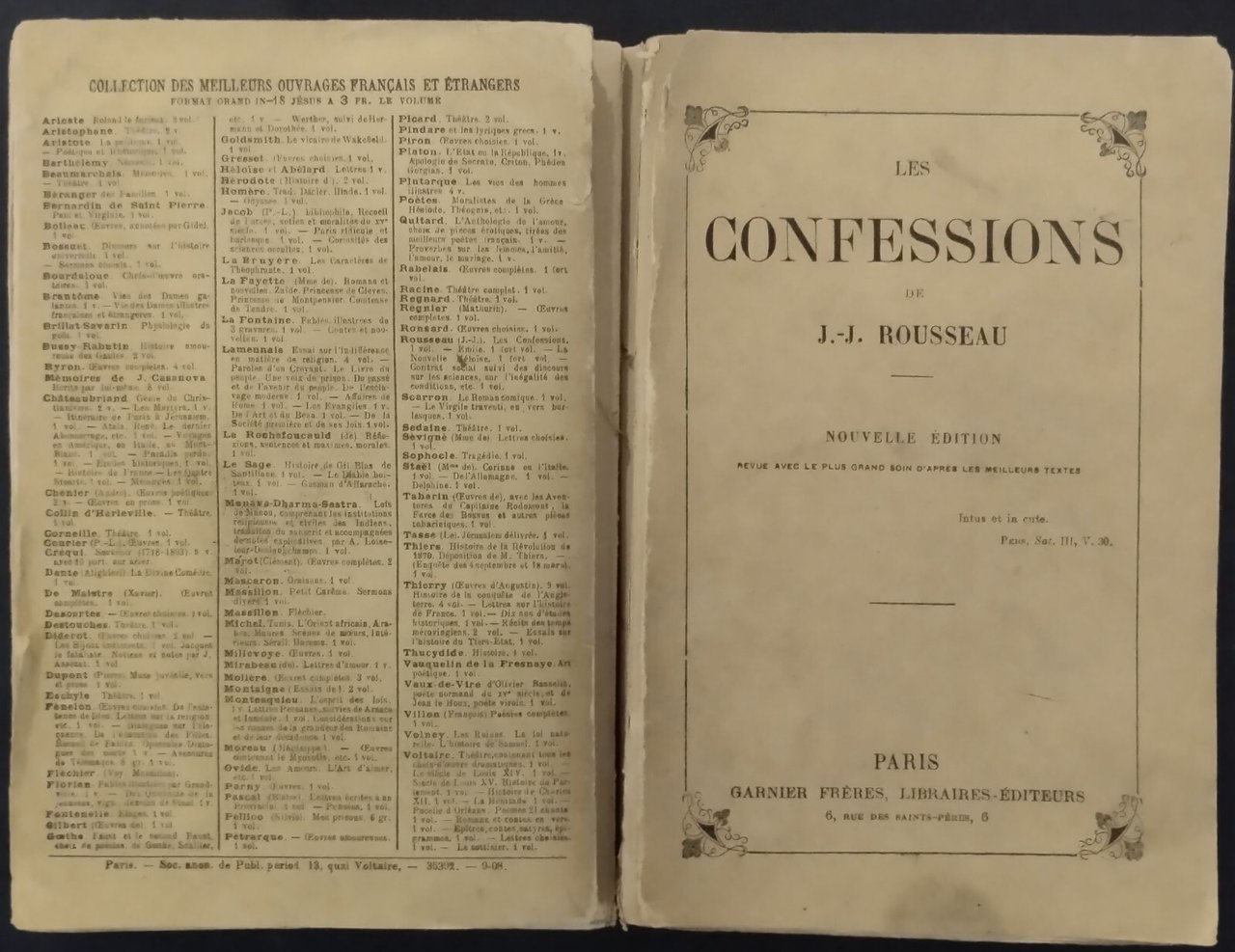 LES CONFESSIONS di J J Rousseau Garnier Freres Libro antico le confessioni