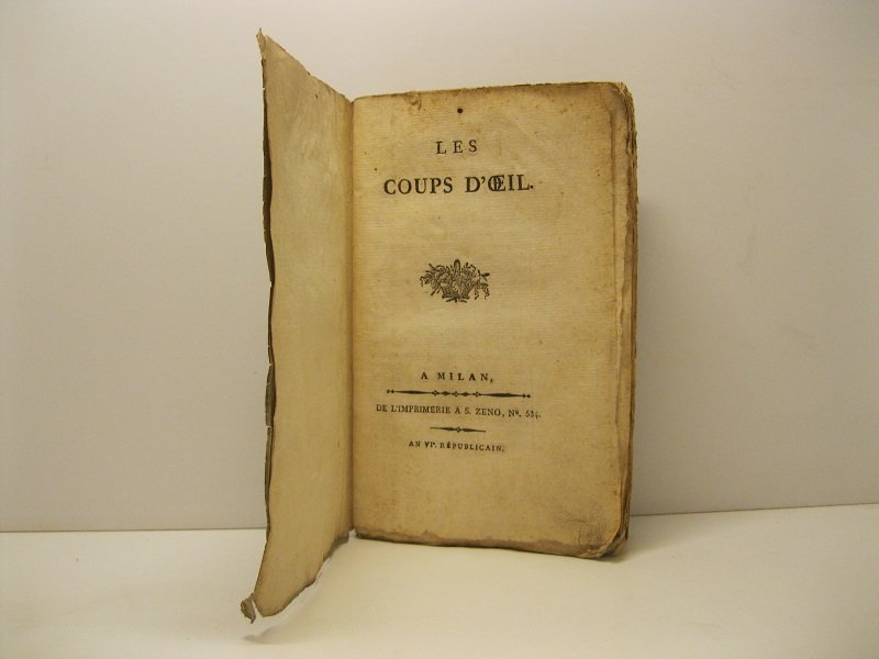 In 8, pp. (4) + 202 + (1) di errata + (1b). Br. muta coeva. Rarissimo e curioso dizionario, attribuito a Jean-François de Bastide (Cremona, De Longis, Rossi, "Una nazione da rigenerare: catalogo delle edizioni italiane 1789-1799", 122, p. 29), prolifico scrittore della seconda meta' del XVIII secolo, autore di antologie, giornali, lettere, romanzi, memorie, racconti, commedie in versi e tragedie in prosa. Scrive l'A. nell'introduzione: "Les coups d'oeil embrasseront les choses et les individues, et se porteront egalement sur le passe', sur le pre'sent, et sur l'avenir. J'ai distribue' mes ide'es alphabetiquement parce que je me suis propose' de former un supplement aux dictionnaires qui servent a' l'usage ordinaire de la langue". Fra i lemmi dell'opera: abaissement, abandon, abalourdir, abatardir. abeille, abominable, bricole, brigand, charlatan, dame, ecc.