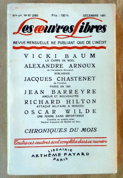 Une revue littéraire brochée de 320 pp. Textes inédits de Vicki Baum; A. Arnoux; J. Chastenet; J/ Barreyre; R. Hilton et Oscar Wilde "Une femme sans importance". Bel état. Voir photo.