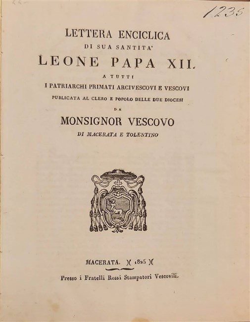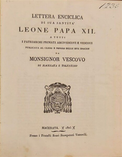 LETTERA ENCICLICA DI SUA SANTITA' LEONE PAPA XII a tutti i Patriarchi primati arcivescovili e vescovi pubblicata al Clero e Popolo delle Due Diocesi da Monsignor Vescovo di Macerata e Tolentino.
