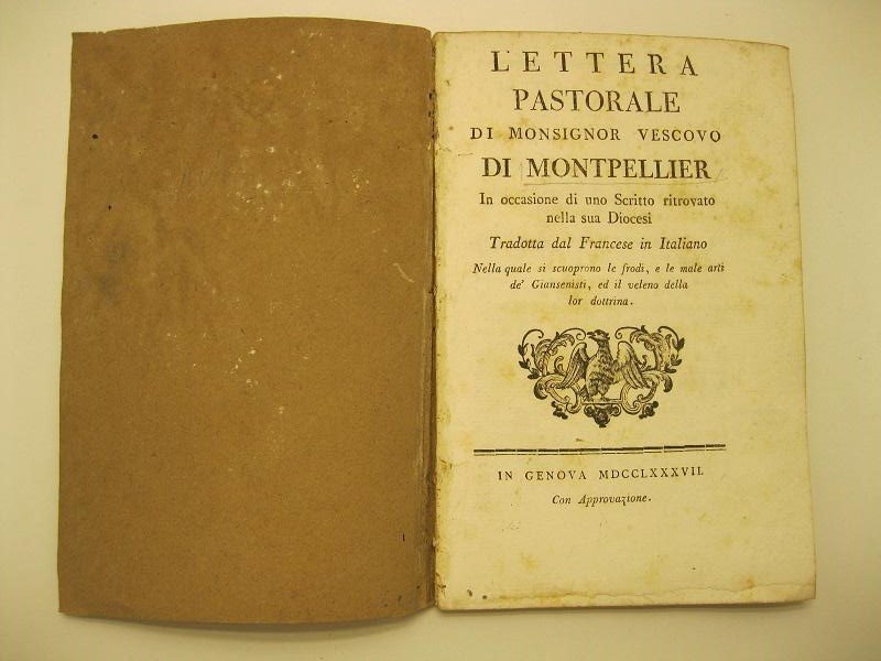 Lettera pastorale di Monsignor Vescovo di Montpellier. In occasione di uno Scritto ritrovato nella sua Diocesi. Tradotta dal Francese in Italiano. Nella quale si scuoprono le frodi, e le male arti de' Giansenisti, ed il veleno della loro dottrina
