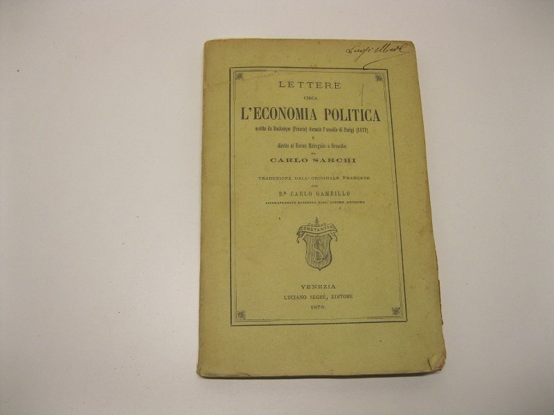 Lettere circa l'economia politica scritte da Dunkerque (Francia) durante l'assedio di Parigi (1871) e dirette al Barone Molroguier a Bruxelles da Carlo Sarchi. Traduzione dall'originale francese del Dr. Carlo Gambillo