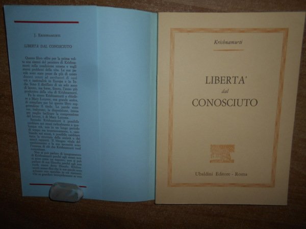 Krishnamurti. Roma, Ubaldini Editore, 1973. LIBERTA' dal CONOSCIUTO. In-8° picc., cartoncino edit. con sovracopertina. 93, (1) pp. Come nuovo. Neg. mob. rosso.