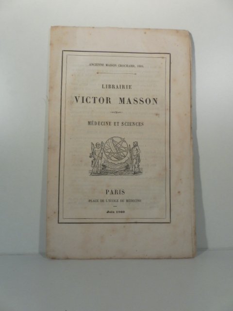 In 8 (cm 13,5 x 22), pp. 32. Bruniture alle pagine. Intonso. Brossura editoriale. Catalogo delle pubblicazioni di scienze e medicina di quest'editore francese.
