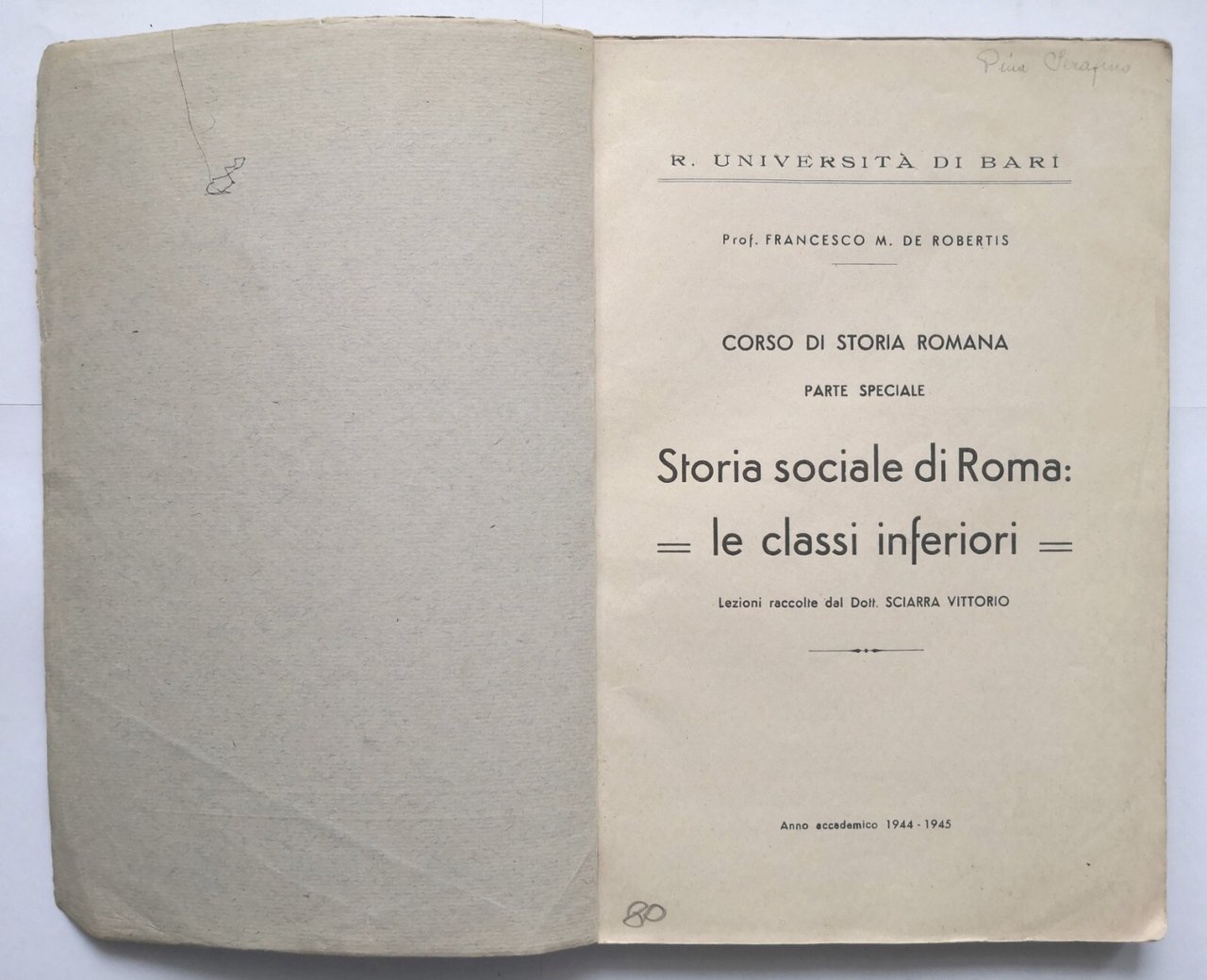 LINEAMENTI DI STORIA SOCIALE ROMANA: le classi inferiori di Francesco M. De Robertis. Anno scolastico 1944-1945. Lezioni raccolte dal Dott. Sciarra Vittorio.