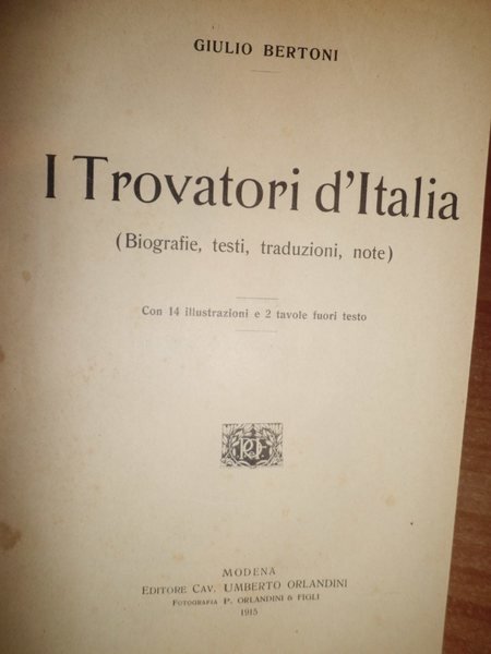 (Lirica medioevale) I Trovatori d' Italia (Biografie, testi, traduzioni, note). Giulio, Bertoni (1878-1942). Modena, Umberto Orlandini Editore, 1915. IN-8°, TELA. XVI, 608 PP. CON 14 FACSIMILI N.T. E 2 TAVOLE F.T. protette da veline. OPERA IMPORTANTE DIFFICILMENTE REPERIBILE. D.E.L.I., P. 350. MAZZONI, P. 145. MANZONI, BIOGRAFIA ITALICA, P. 344. Edizione originale. Ottimo esemplare. Neg. esot. mob. 72 dietro