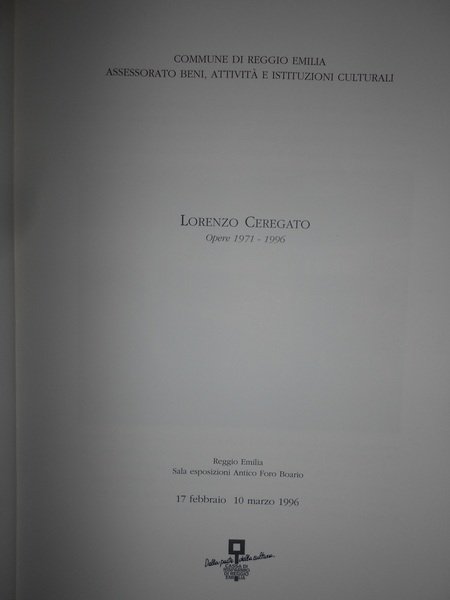 LORENZO CEREGATO Opere 1971 - 1996. Reggio Emilia, Sala esposizioni Antico Foro Boario 17 febbraio 10 marzo 1996. In-8°, cartoncino edit. con risvolti. Pagine non numerate con numerose illustrazioni fotografiche a colori e in bianco e nero delle opere dell' Artista. In ottimo stato di conservazione con invio autografo dell' Artista ad un amico nella prima bianca. Neg. arte mob. 18