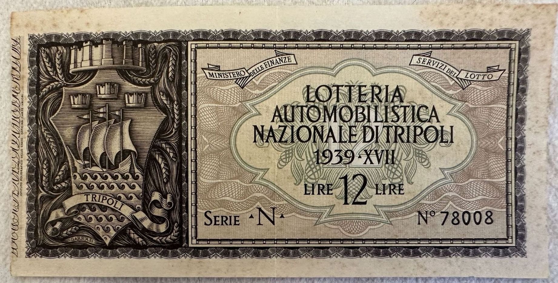 Rarissimo biglietto della lotteria automobilistica nazionale di Tripoli collegata con la corsa automobilistica del XIII Gran Premio di Tripoli che si disputerà il 7 maggio 1939. In ottime condizioni. In 16. 7x14 cm.Very scarce ticket of the lotteria automobilistica nazionale di Tripoli connected with car racee of the XIII Gran Premio di Tripoli which will take place the 7th of may 1939. In very good conditions. In 16. 7x14 cm.