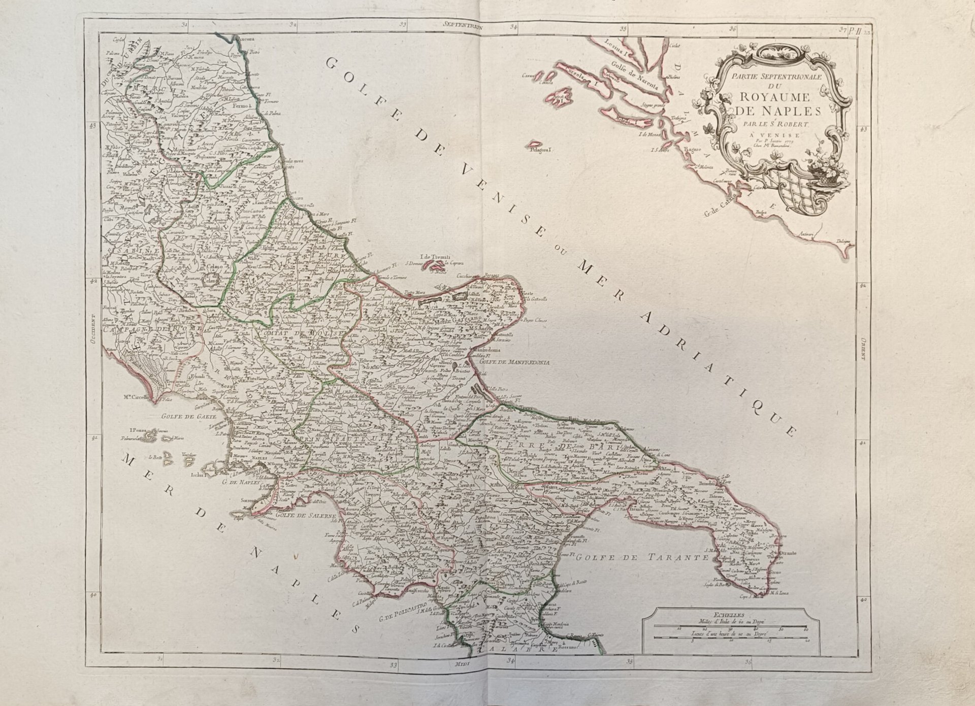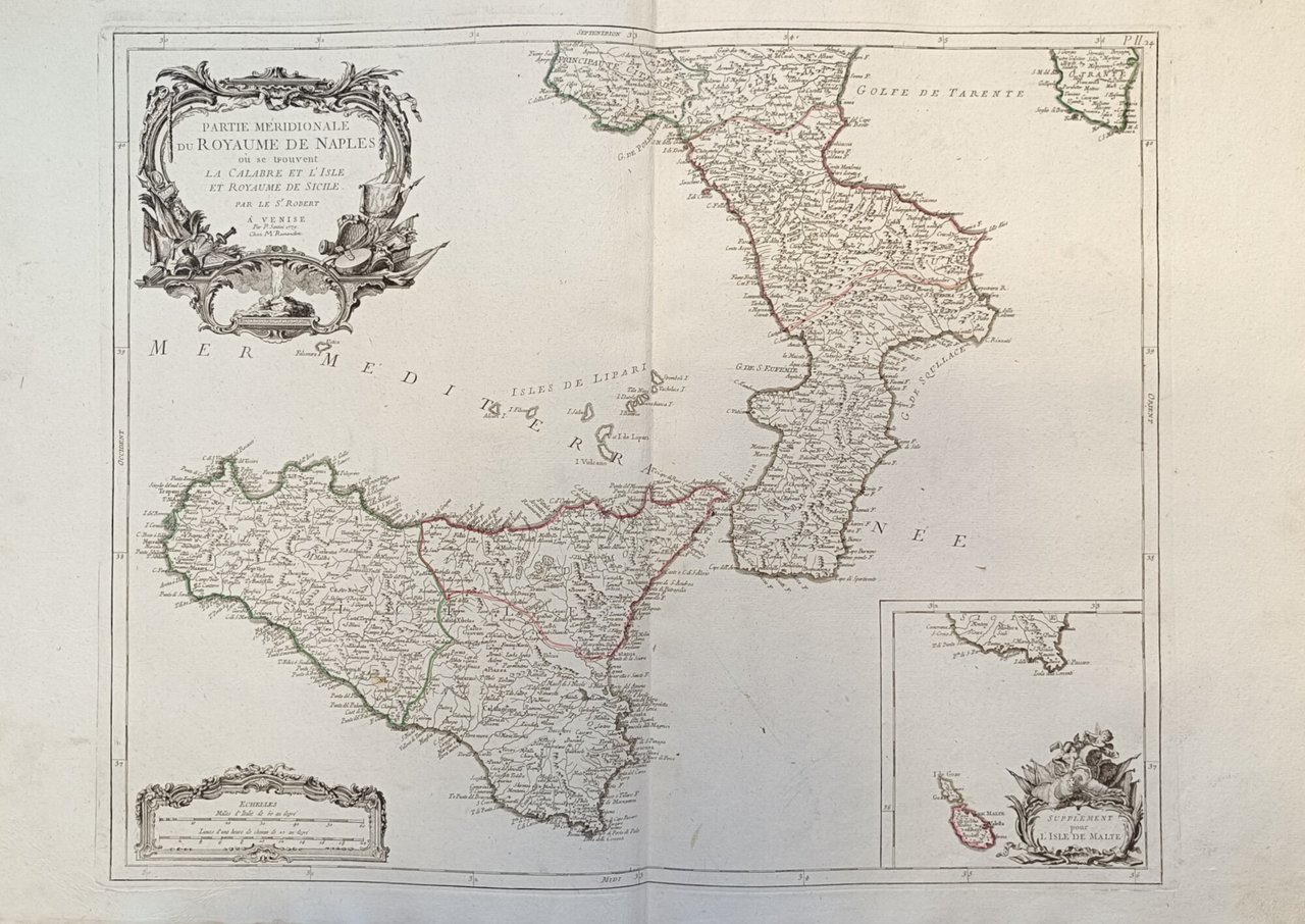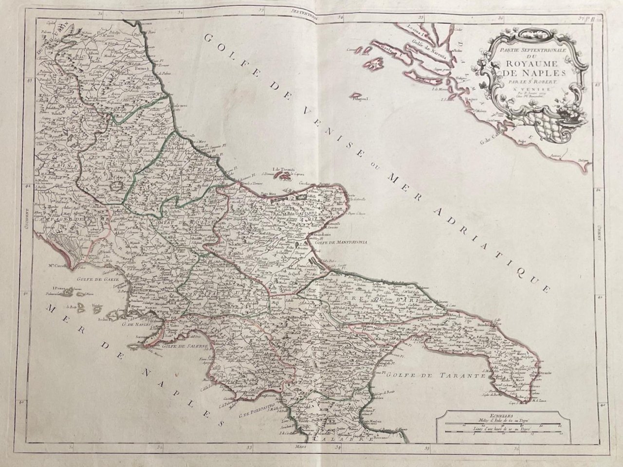 Lotto di due mappe comprendenti:- partie septentrionale du Royaume de Naples.- partie meridionale du Royaume de Naples, où se trouvent la Calabre et l'Isle et Royaume de Sicile.Dall' “Atlas Universel” stampato a Venezia nel 1776 e nel 1784. acquaforte acquerellata a mano inciso cm. 60,7 x 49 Buono (Good) Buon es..