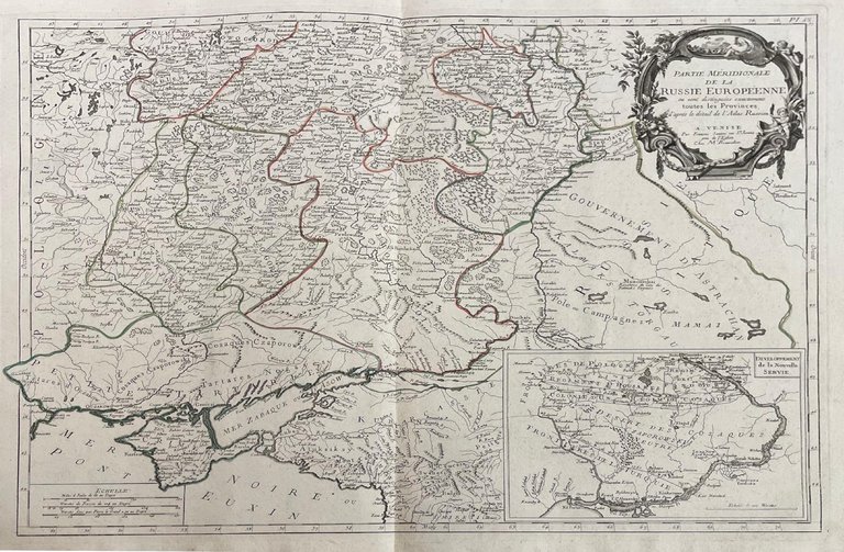 Lotto di due mappe dall' “Atlas Universel” stampato a Venezia nel 1776 e nel 1784, comprendente: - Partie septentrionale de la Russie Européenne ou sont distinguees exactement toutes les Provinces, d'aprés le detail de l'Atlas Russien.- Partie méridionale de la Russie Européenne ou sont distinguees exactement toutes les Provinces d'aprés le detail de l'Atlas Russien.Il soggetto riprende la precendete carta di R. De Vaugondy. acquaforte acquerellata a mano inciso cm. 51 x 66,8 Buono (Good) Buon es..