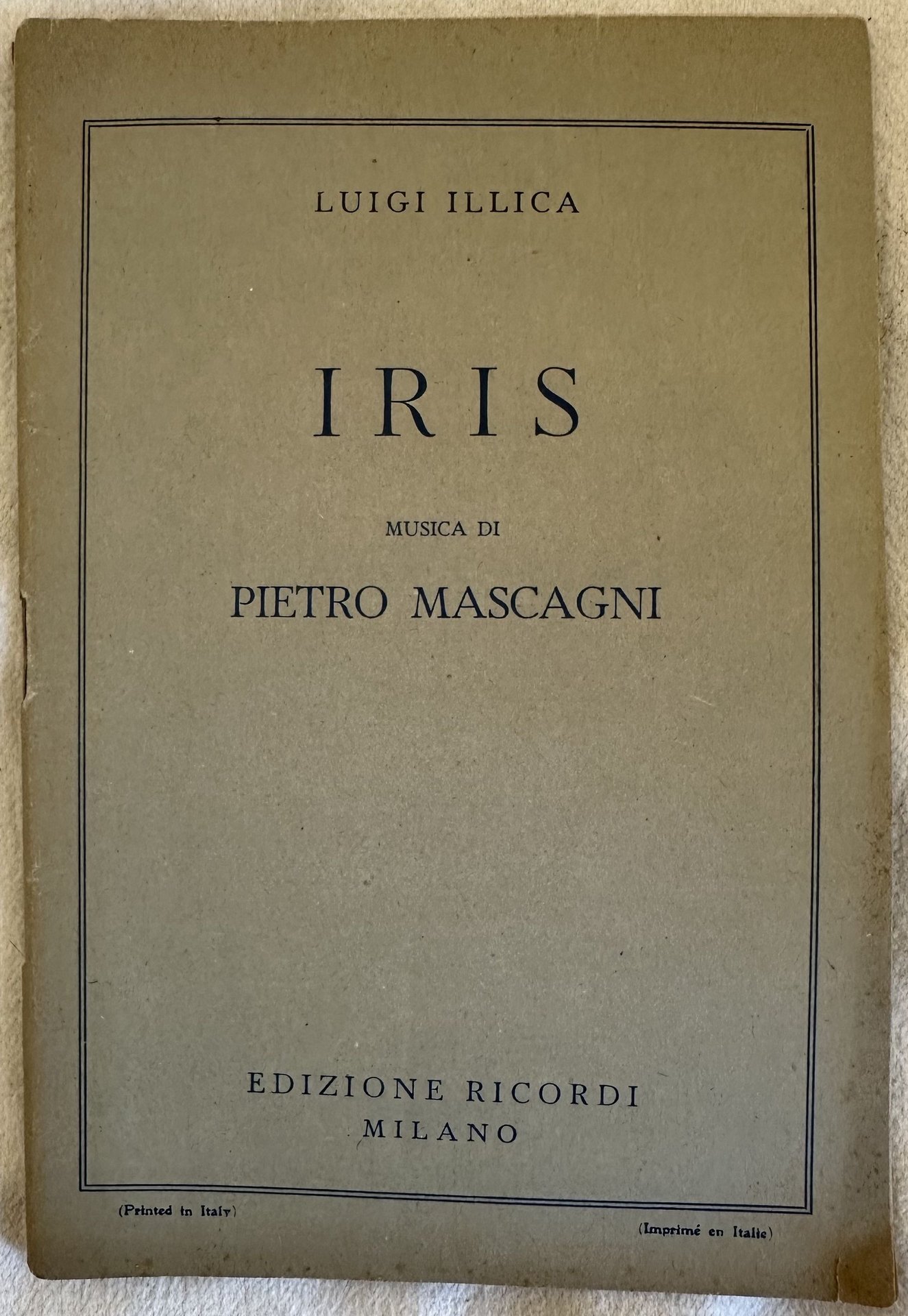 Bel libretto d'opera degli anni '30 dell'opera "Iris" di Pietro Mascagni su libretto di Luigi Illica.<BR>La prima rappresentazione ebbe luogo al Teatro dell'Opera di Roma il 22 novembre 1898. Indicazione manoscritta degli attori della rappresentazione del 19 maggio 1957 al Teatro La Scala diretta da Gavazzeni. In buone condizioni. Brossura editoriale in buone condizioni generali con lievi usure ai margini e dorso. Piatto anteriore in parte staccato. Legatura in buone condizioni. All'interno le pagine si presentano in buone condizioni con fioriture.In 8. Dim. 19,5x13,5 cm. Pp. 47.Beautiful booklet of 1930's of the work "Iris" by Pietro Mascagni on booklet by Luigi Illica. The first representation took place in the Teatro dell'Opera of Rome the 22nd of november 1898. Handwritten indication of actors and date 19th of may 1957. In good conditions. Editorial cover in good general conditions slightly worn in the extremities. Front plate partially detached. Binding in good conditions. Inside pages are in good conditions with foxing. Missing parts in the title page. In 8. Dim. 19,5x13,5 cm. Pp. 47.