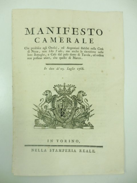 In 4, pp. 4. Stemma xilogr. al front. Manifesto camerale che vieta agli orefici di Nizza il possesso dei pesi detti di marco e di tavola dall'uso dei quali possono derivare abusi e frodi per il pubblico.