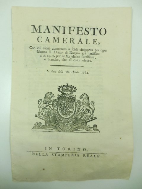 Manifesto camerale con cui viene aumentato a soldi cinquanta per ogni salmata il Dritto di Dogana gia' tariffato a ss. 24.2 per le majoliche forestiere, si' bianche, che di color oscuro. In data delli 28 Aprile 1764