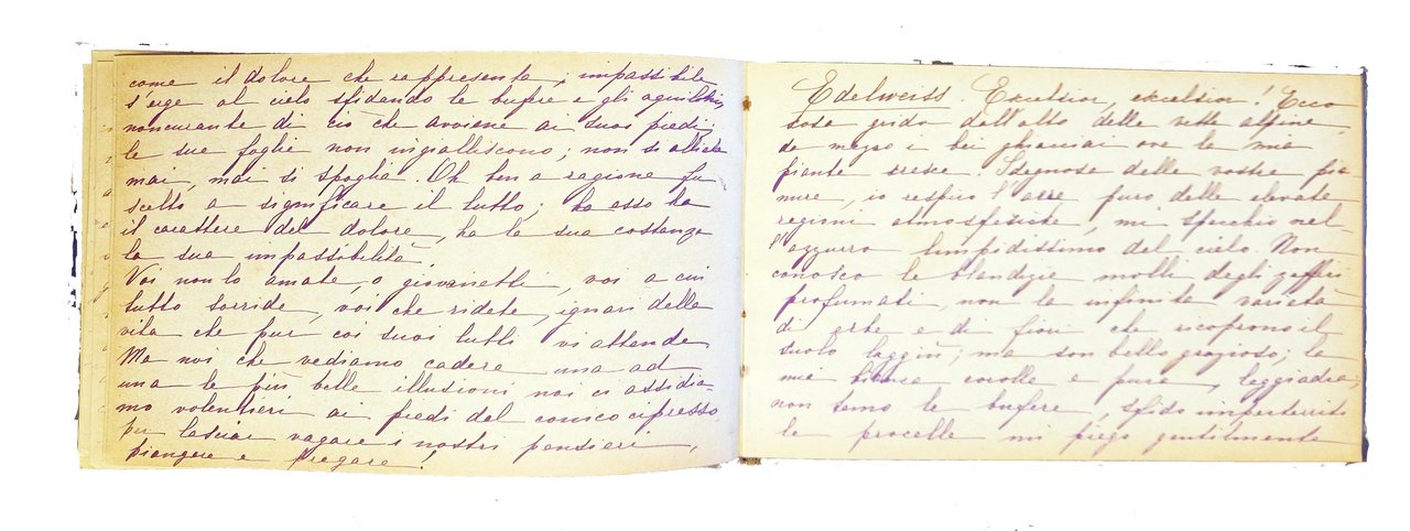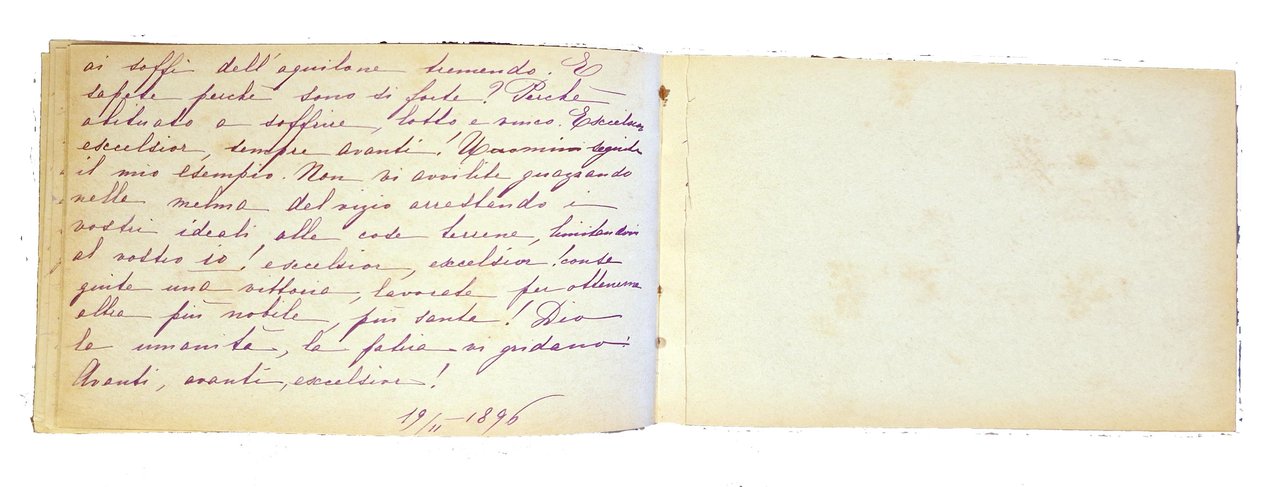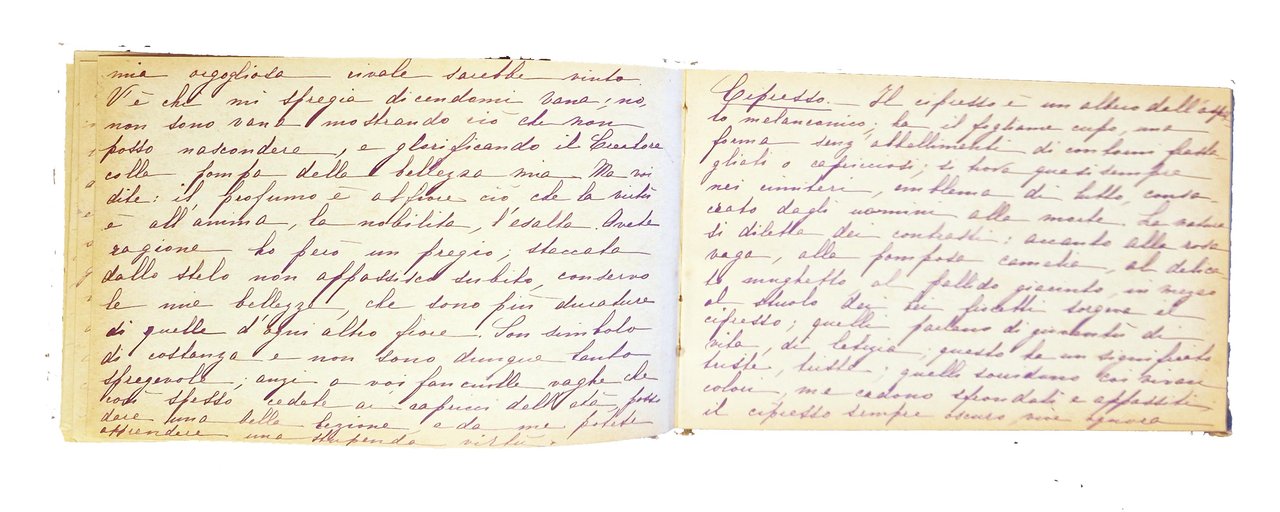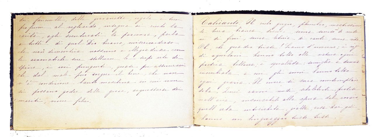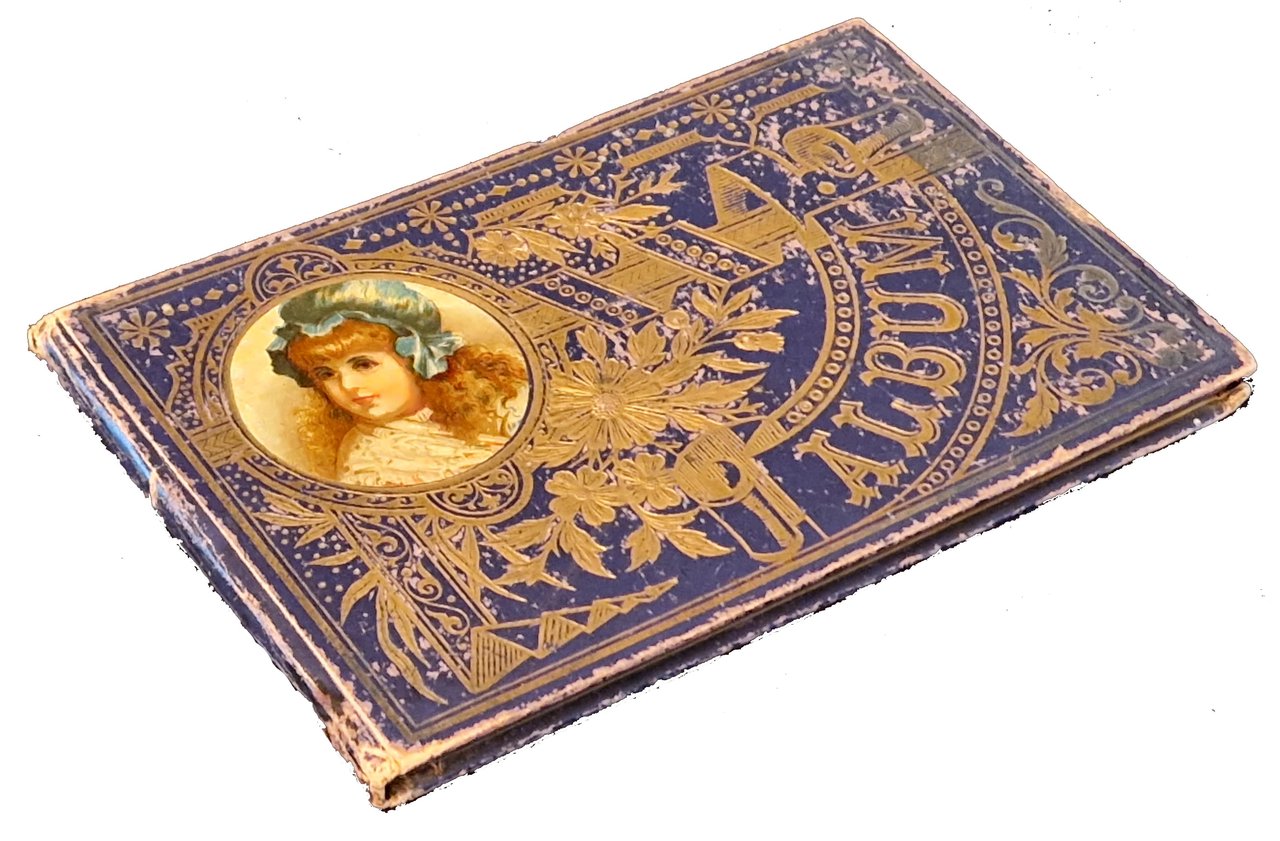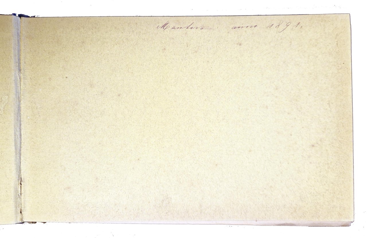 Piccolo album in oblungo, 112x176 mm, con legatura originale ottocentesca, con piatti in cartonato rigido blu, ricchi decori impressi e dorati al piatto anteriore, con ritratto di bimba a colori su ritaglio circolare di carta patinata incollato tra i decori, tagli dorati; testo manoscritto, tutto dalla stessa mano, composto da 38 carte, delle quali le prime 10 e la dodocesima sono scritte, le altre sono bianche. Alla prima guardia libera anteriore è scritto "Mantova anno 1891"; poi è inizia il testo, intitolato "langage des fleurs", che prima riporta alcune note sull'albero e, a seguire, prosegue con note su biancospino, calicanto, amaranto, camelia, cipresso e edelweiss, alla cui fine è riportata la data 19/11/1896. Dopo una carta bianca c'è una carta scritta, riferita all'amore ("la donna è nata per amare … "). Cond.: Tracce d'uso alla legatura (abrasioni ai bordi dei piatti e al dorso). Carte leggermente ingiallite con occasionali fioriture e bruniture ai margini. Una carta presenta piccoli strappi, con marginale perdita di testo. Nel complesso è un buon esemplare. -- SMALL MANUSCRIPT ALBUM, ENTITLED "LANGAGE DES FLEURS", WITH A RICHLY DECORATED HARD CARDBOARD BINDING. On the first free front flap is written "Mantova anno 1891"; then the text begins, which first reports some notes on the tree and, subsequently, continues with notes on hawthorn, calycanthus, amaranth, camellia, cypress and edelweiss, at the end of which is reported the date 19/11/1896. Good copy.