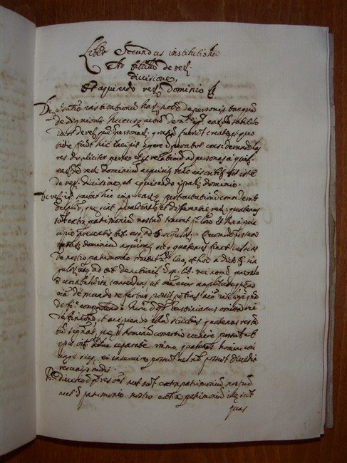 manoscritto cartaceo in-4 antico (mm.214x155), ccnn 97, 1 cb, ccnn 75, leg. p. perg. molle secentesca. Testo suddiviso in quattro Libri, in chiara grafia secentesca redatto in lingua latina, in cui l'anonimo autore tratta di diritto civile e in particolare del diritto di famiglia: De ius de personae, De patria potestate, De nuptiis tractatus, De adoptionibus, De tutelis, De testamento, De fiduciaria tutela, De tutore, De superstitis tutore, De servitute urbana et rustica, De hereditate liberata, De legatis, De fidei comissio, De cognatibus successione, De tutela reis, De servorum, De exceptibus et replicationibus, etc. Picc. mancanza della perg. ai piatti. [344]