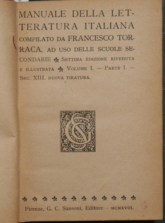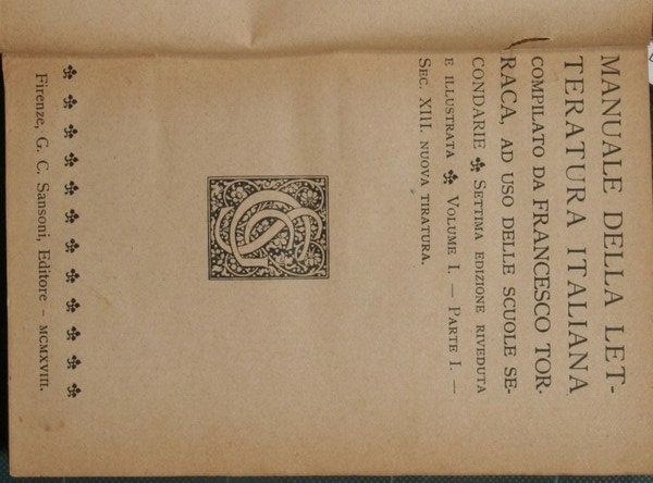 Compilato da Francesco Torraca ad uso delle scuole secondarie - Settima edizione riveduta e illustrata. Nuova tiratura - in 16° - pp.424 - Mezza tela dorso con titolo in oro - Illustrazioni in b/n nel testo - Titoli al dorso sbiaditi - Parte I. Sec. XIII - Parte II. Sec. XIV