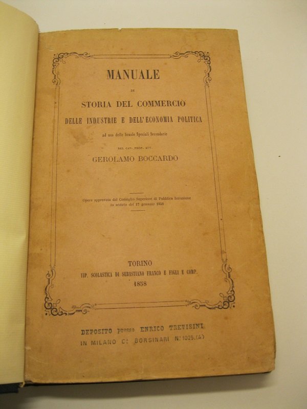 In 8, pp. XX + 462 + (2) con ritr. dell'a. inc. in antip. T. tl. mod. (Cons. la br. ed. ). Manuale di storia economica che completa, per la parte storica, il Manuale di economia politica precedentemente pubblicato dall'economista genovese. Edizione originale.