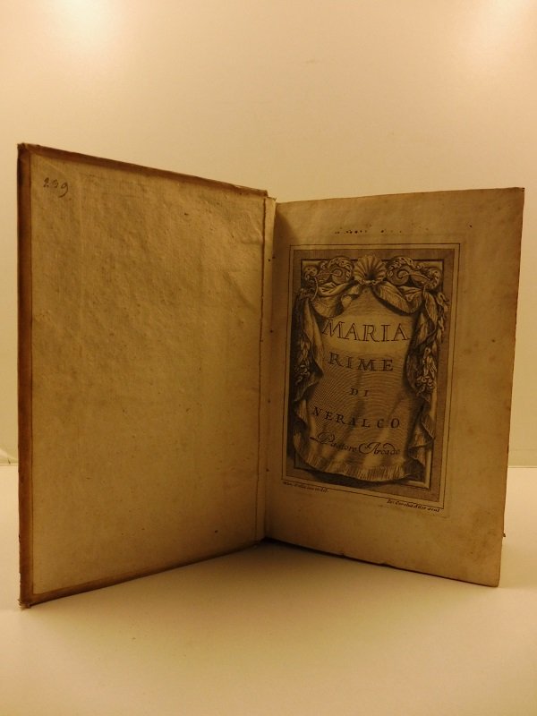 2 parti rilegate in un tomo in 16 (cm 13 x 20), pp. (2) + VIII + 141 + (1 bianca) con 8 tavole incise all'acquaforte nel testo compreso il frontespizio illustrato che precede quello con il solo titolo; VIII + 155 + (1 bianca) con 7 tavole incise all'acquaforte nel testo; 140 con 5 tavole incise all'acquaforte fuori testo, testatine e finalini incisi. Legatura in piena pergamena coeva. Elegante edizione romana non citata dal Gamba (che cita per Maria una edizione di Padova del 1725 e per la Sulamitide una del 1732) particolarmente gradevole per le molte incisioni, testatine e finalini, perlopiu' su disegno L. Ghezzi e incise da Allet, Franceschini, Grandi, Mazzoni, Van Westerhout. L'A. e' Giuseppe Maria Ercolani (1672-1759), che si firma con lo pseudonimo arcade di Neralco. Di nobile famiglia marchigiana, affianco' ai doveri ecclesiastici vari interessi che lo avvicinarono alla poesia (col nome di Neralco Castrimeniano comparve fra gli Arcadi, avendo anche fatto parte dell'Accademia degli Infecondi), alla matematica, alla geografia e all'architettura.
